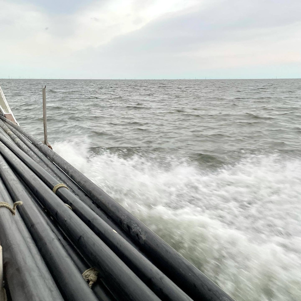 8月末の漁場割で立てた基点を目印に、支柱を海に刺して海苔漁場を作ります。