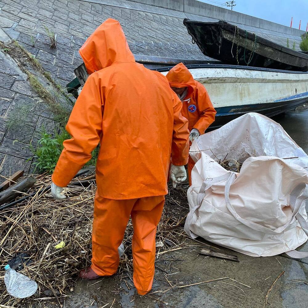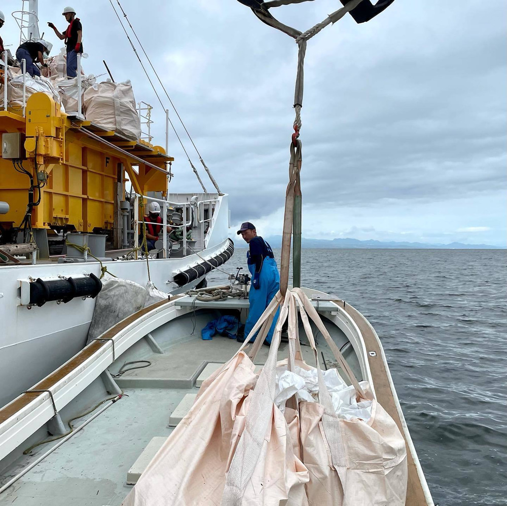 流木や漂流ゴミを船に引き上げ、沖に待機している回収船で持って行ってもらいます。