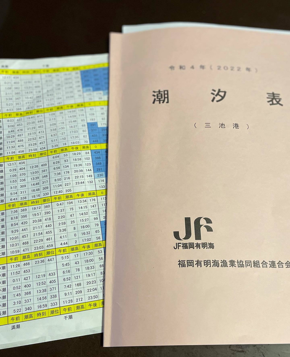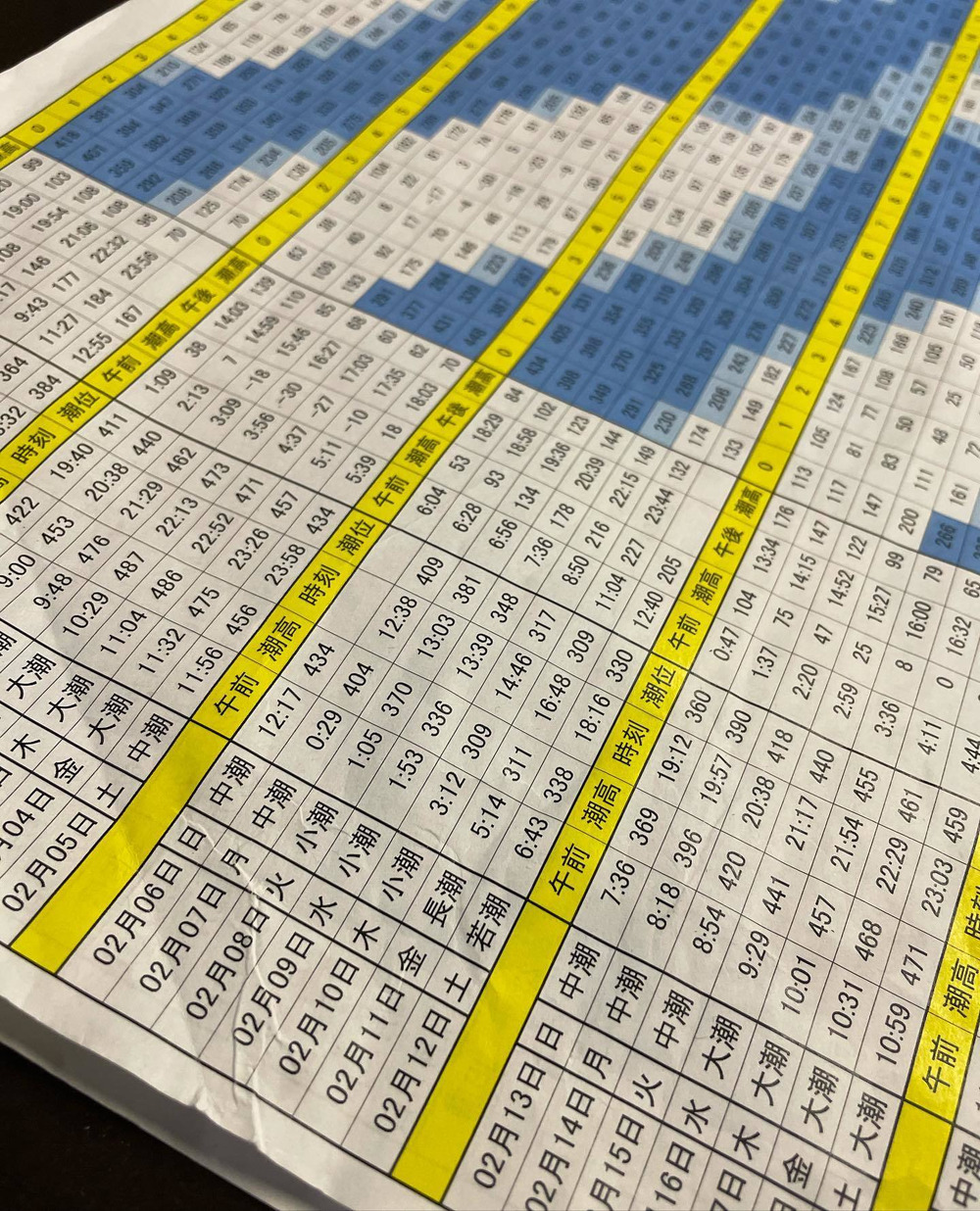 仕事開始時間は潮汐表を見て決めるので、いつも干潮満潮の時間や潮位の数字とにらめっこ。