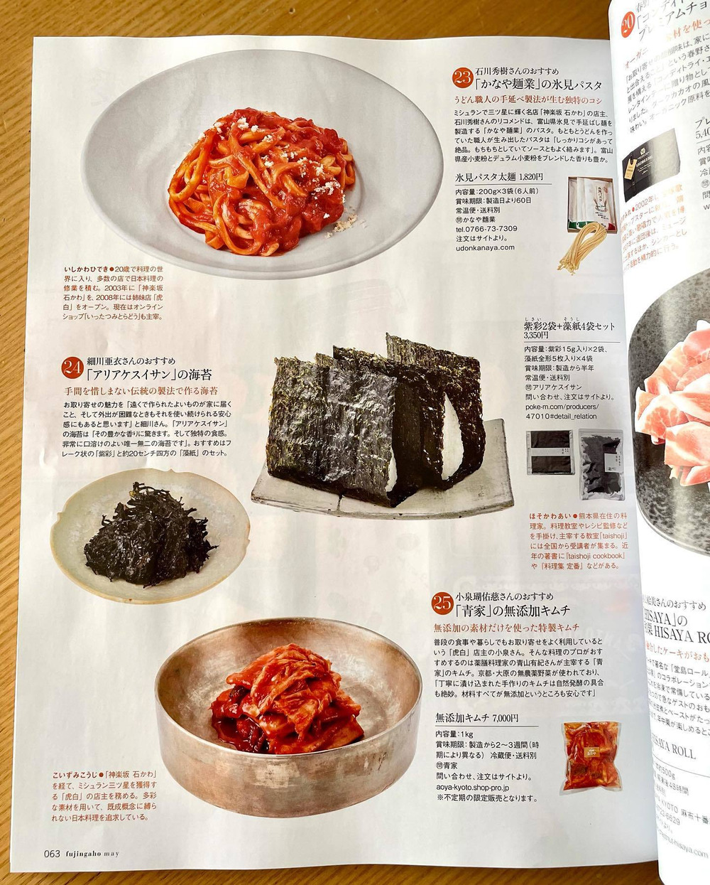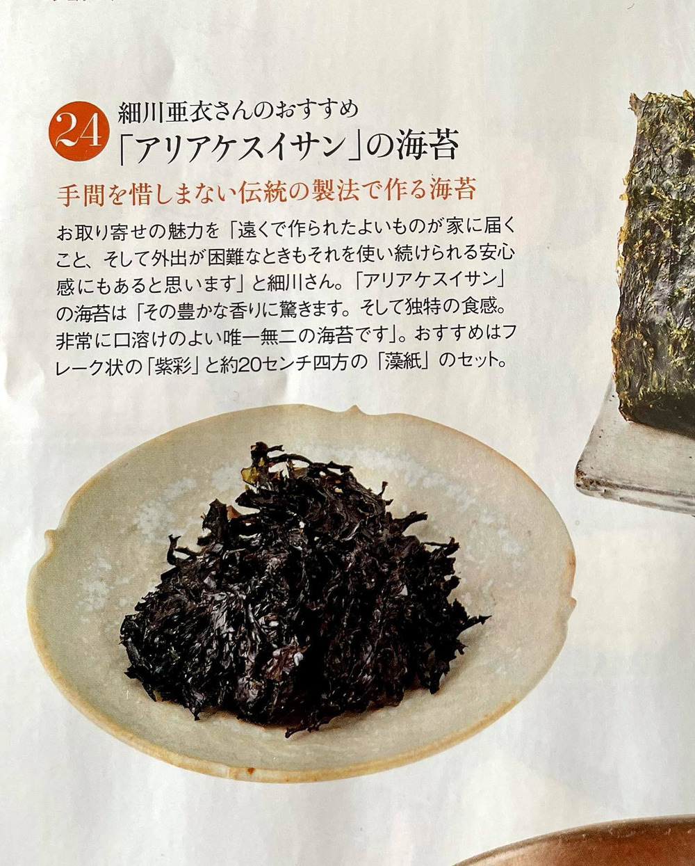 『婦人画報』5月号のお取り寄せ特集にて、料理家細川亜衣さんのおすすめとしてアリアケスイサンの『紫彩』と『藻紙』をご紹介いただきました。