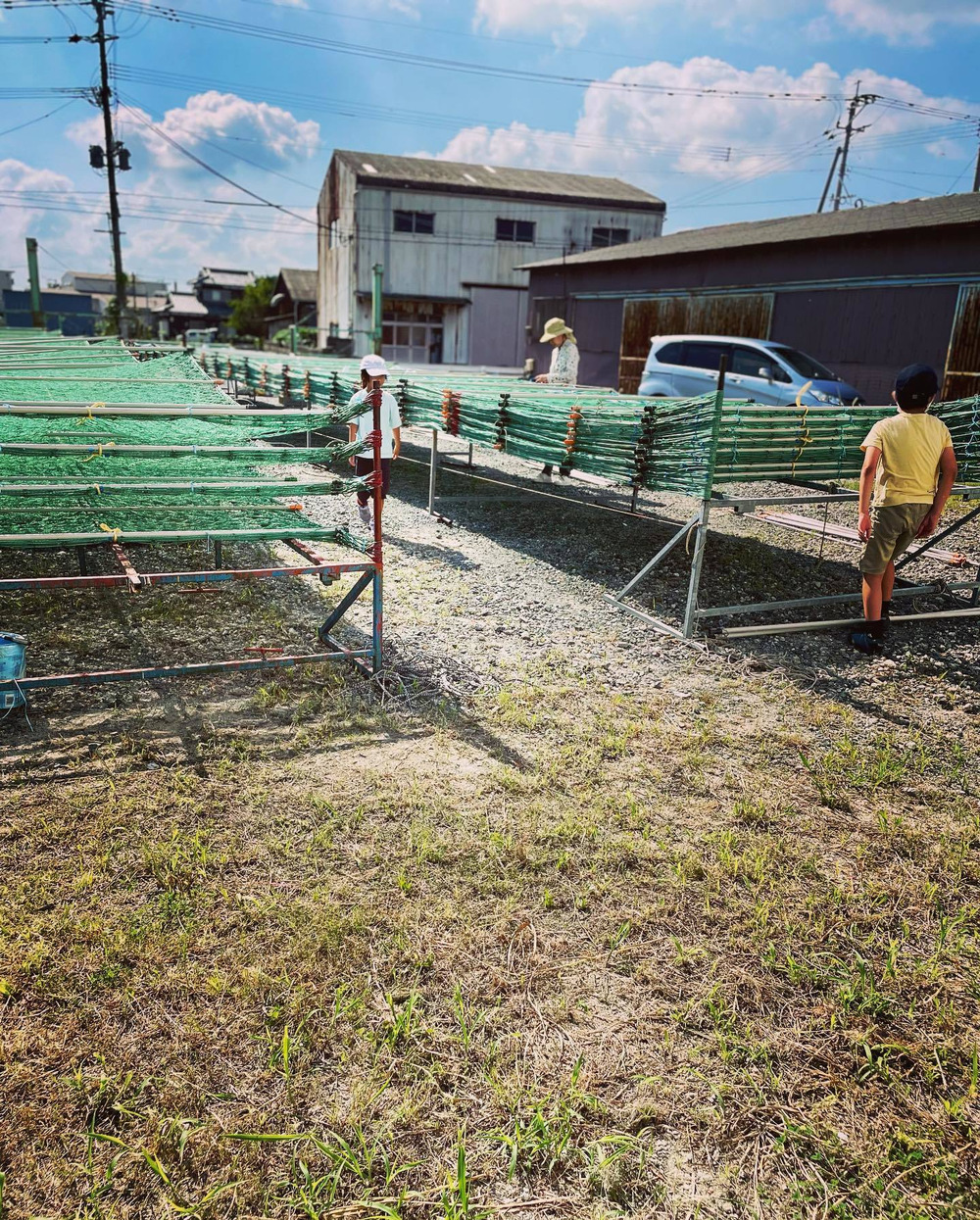 5月に修理して整理していた海苔網を、専用の樹脂液に漬けて海苔の種が付きやすいようにコーティングします。
