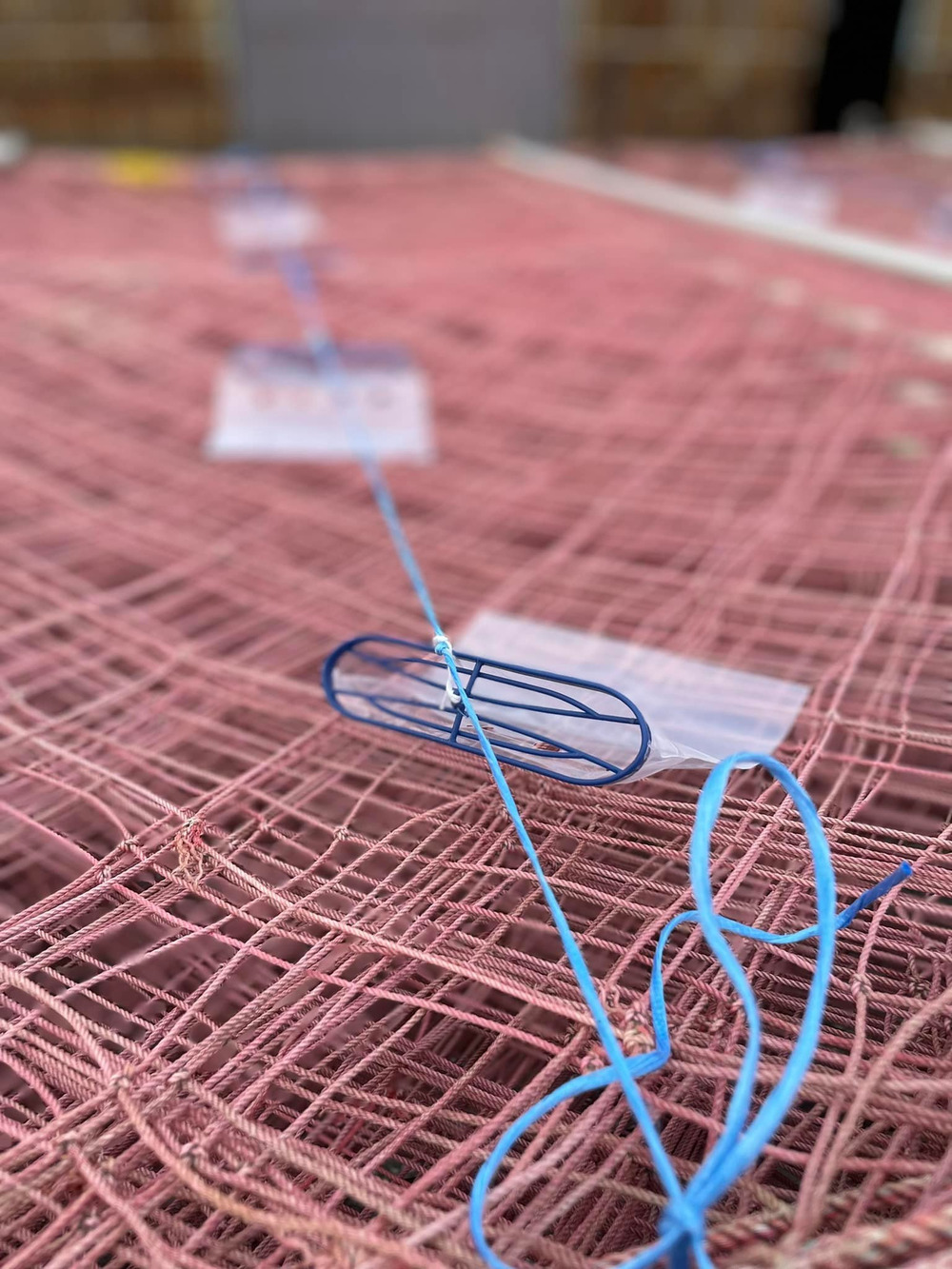 干して乾いたら、浮きになる中が空洞の棒を等間隔に付け、海苔のの種を入れるビニール袋を取り付けて丸めます。
