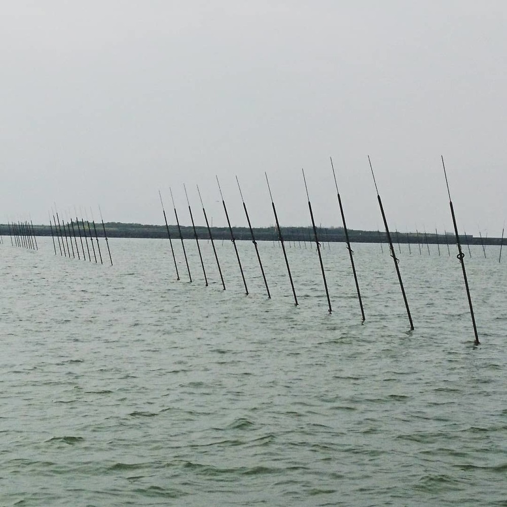 通常干潮前後の支柱を立てやすい水位でおこないます。