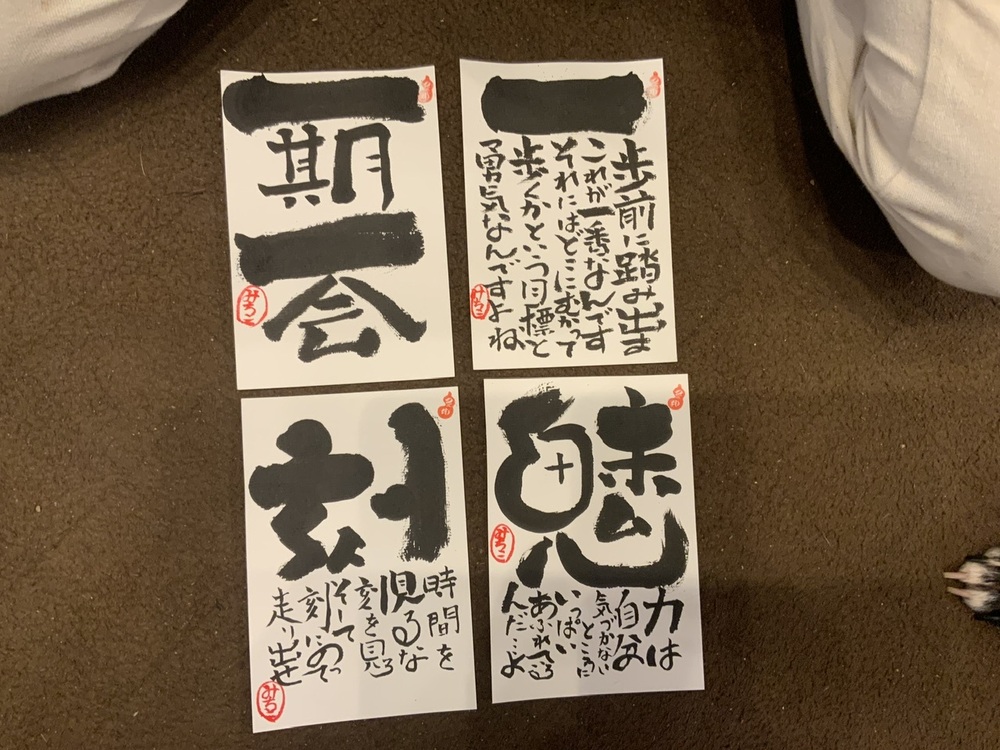 先日、足立柿園の己書幸座を行いました。今月は筆ペンを使って太い文字に挑戦しました。普段の習字とは違う書き方なので、最初はみなさん戸惑っていましたが、やっていくうちにだんだん慣れてきて、力強い線が出せるようになっていました。