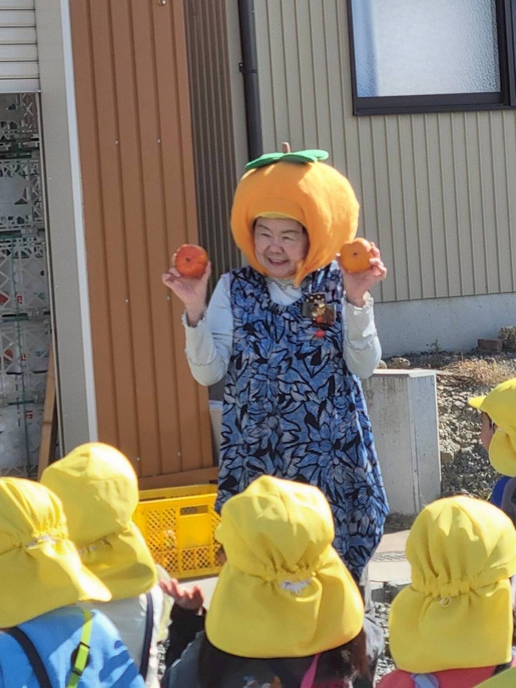 写真は、みんなで集まって「柿レディー」のお話を聞いているところです。
