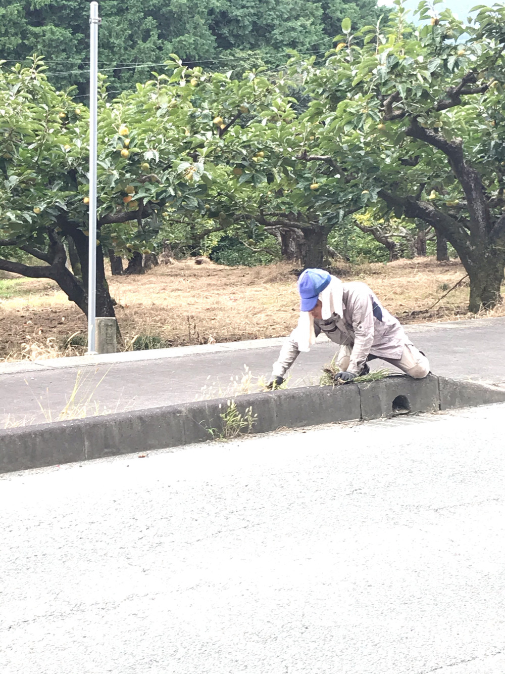 写真は草取りをしてくれている社員さんです。道の両脇は柿の果樹園です。