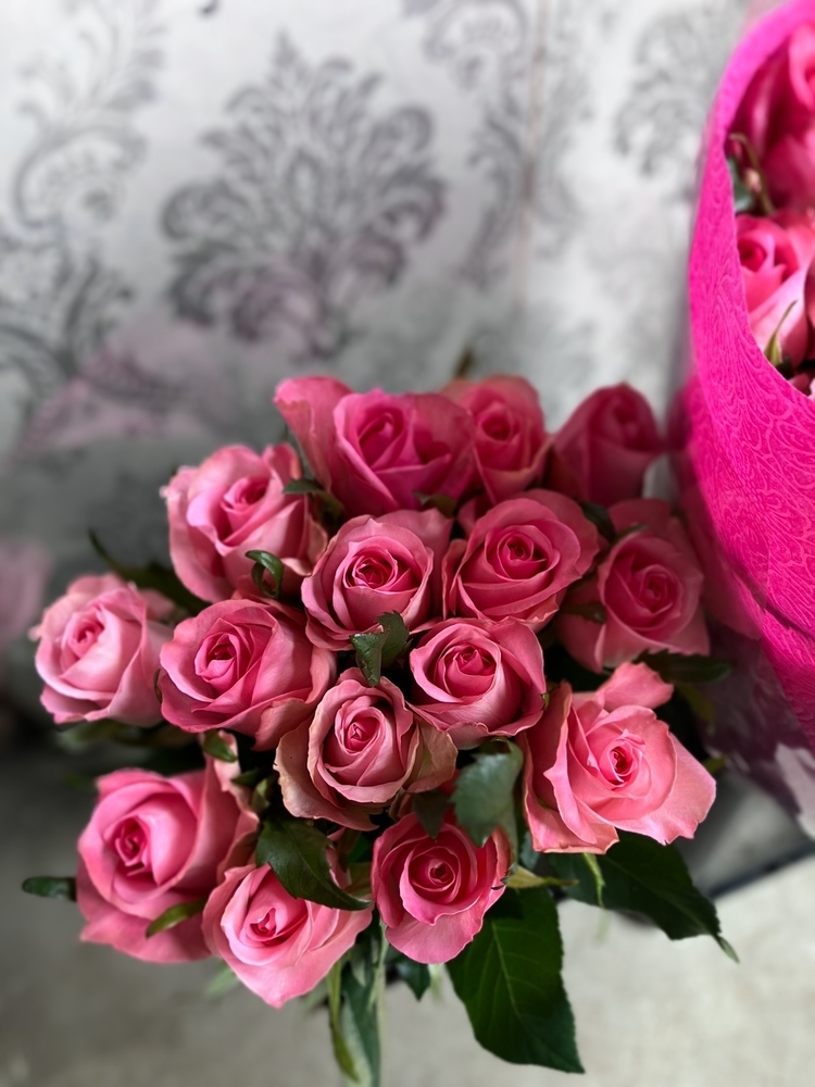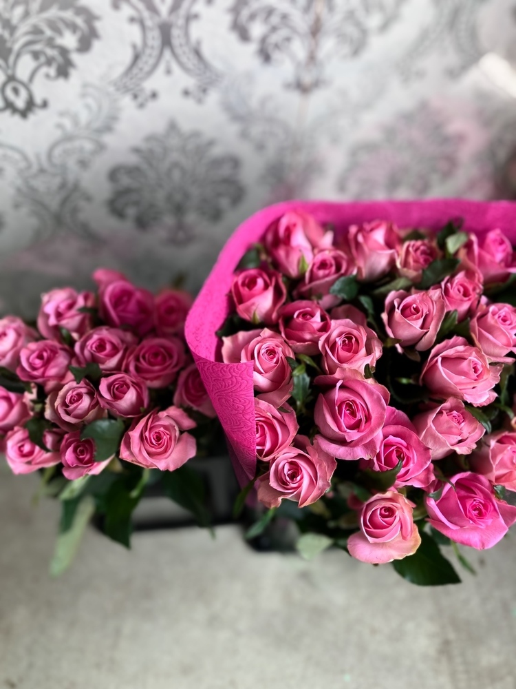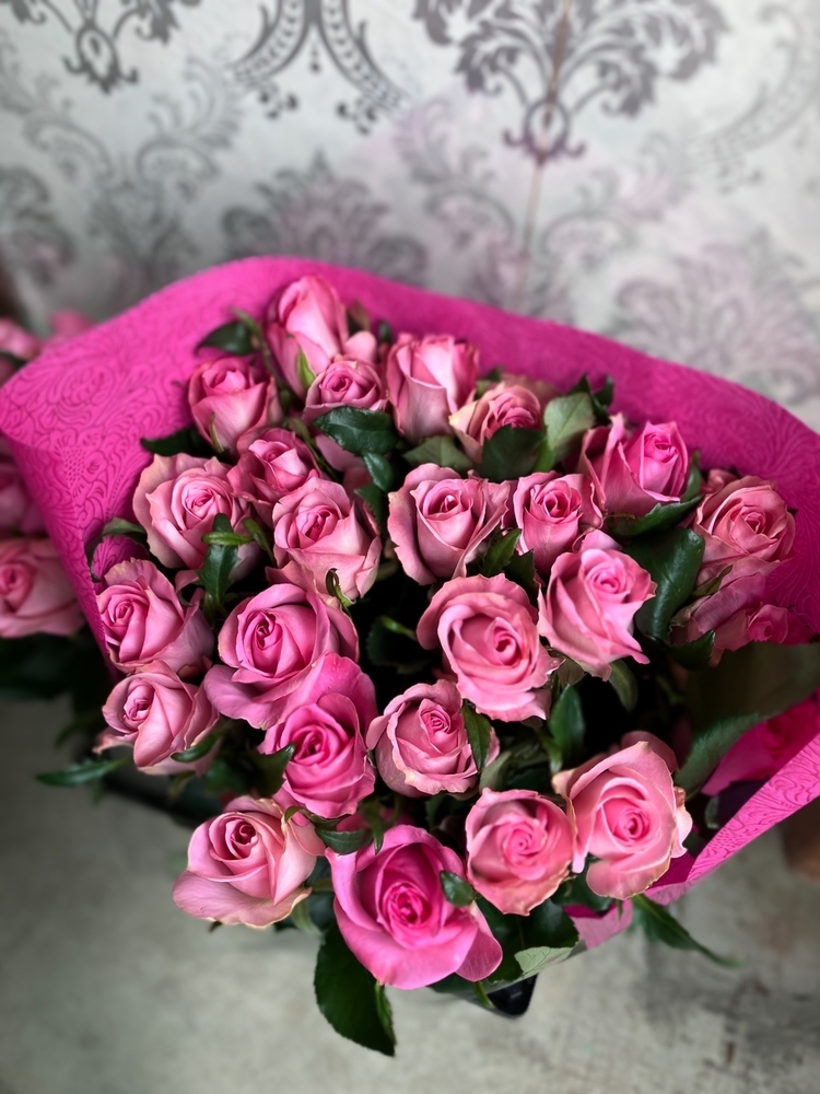 ブロッサムピンクの贈答用花束(25本)とご自宅用簡易ラッピング(15本)です!