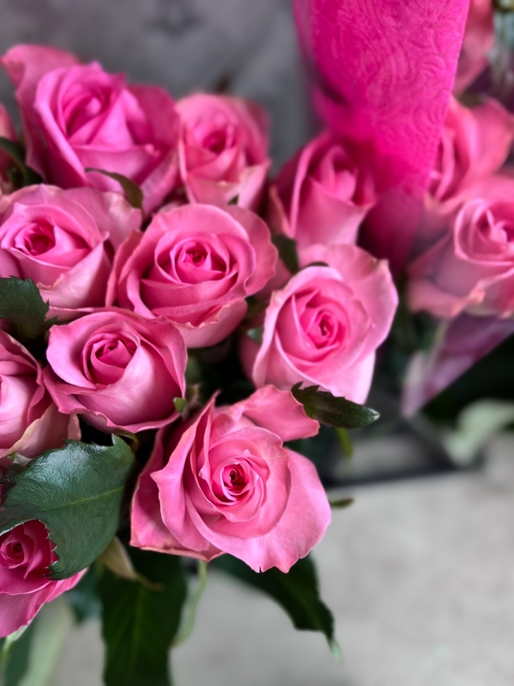 ブロッサムピンクの贈答用花束(25本)とご自宅用簡易ラッピング(15本)です!