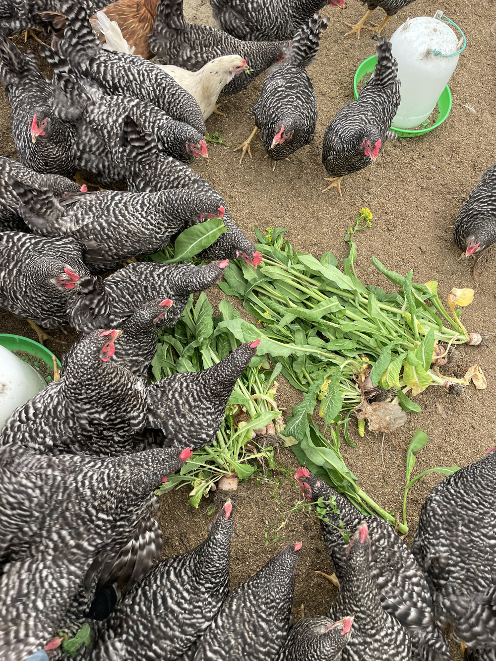 アリとキリギリス農園の今日のおやつは越冬野沢菜です。発酵飼料プラス安心安全な鶏糞で育った自家栽培野菜を与えています。