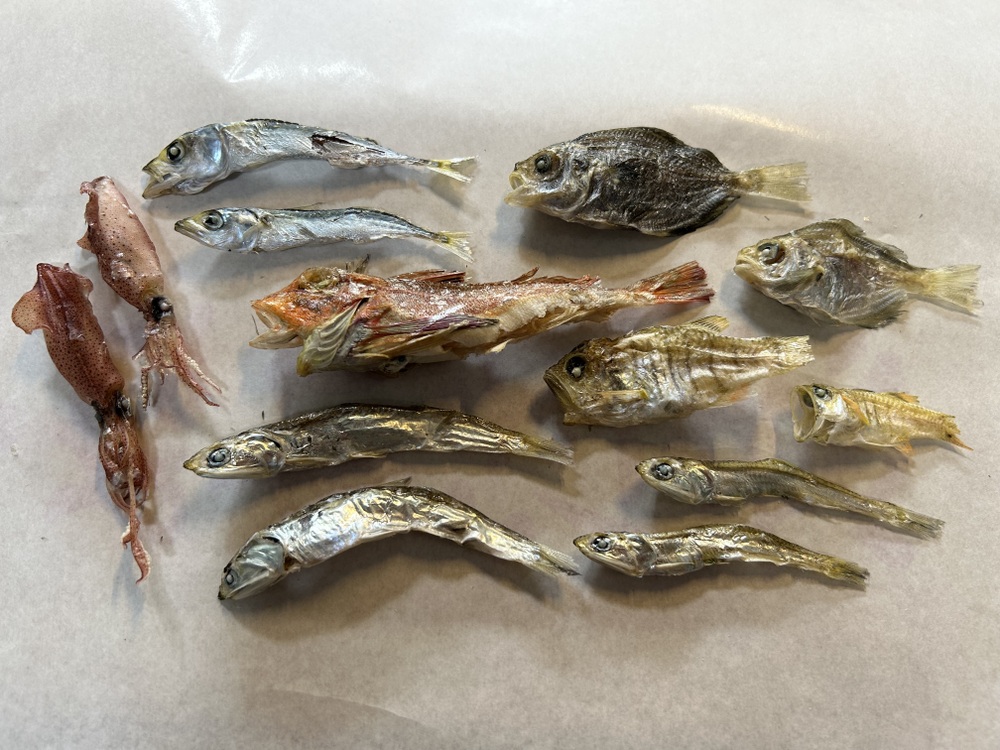 中央赤いのは「ホウボウ」・「サバ」・「メンパチ」・「イカ」と「イボダイ」と思われる稚魚です