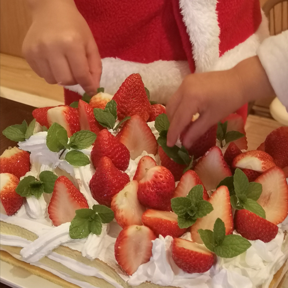 バタバタとしてイチゴとスペアミントだけのクリスマスケーキですが、子供たちの好きなキャラクターを写真印刷をして乗っけると喜んでもらえました(^^;✨