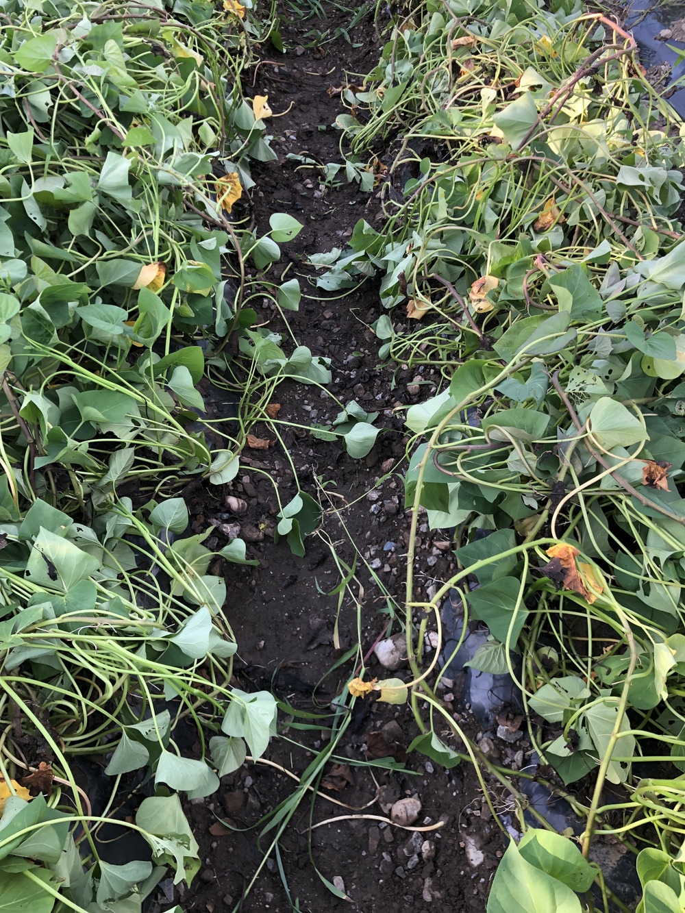 今日、さつまいものつる返し作業を行いました。さつまいもは、伸びたツルから根を張り、そこにも芋を作ろうとします。一見、さつまいもの成長旺盛だね〜!って思ってしまいますが、肝心の芋は意外と大きくなってない!っていう事もあります。なので、つる返しをして、葉っぱに蓄えた養分を根(さつまいも)に送りなさいよー!そろそろ収穫も時期ですよー!って教えてあげます。そんな作業です。