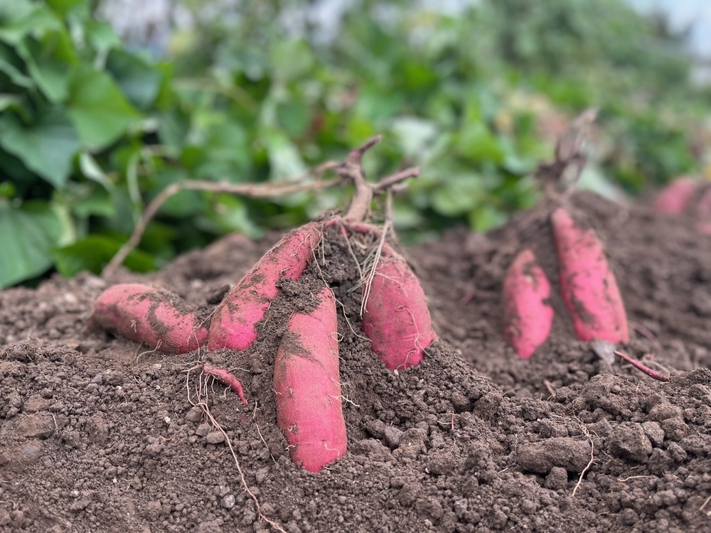 今年は猛暑でしたが暑さに負けずに成長してくれました。また、降雨が少なく、甘さのあるサツマイモになっていることと願っています。(願望)