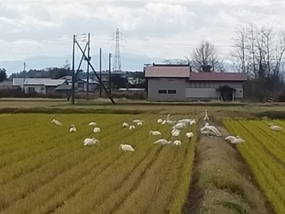 田んぼの方がやけに賑やかだなあと思って見に行ったら、たくさんの白鳥がおりました。