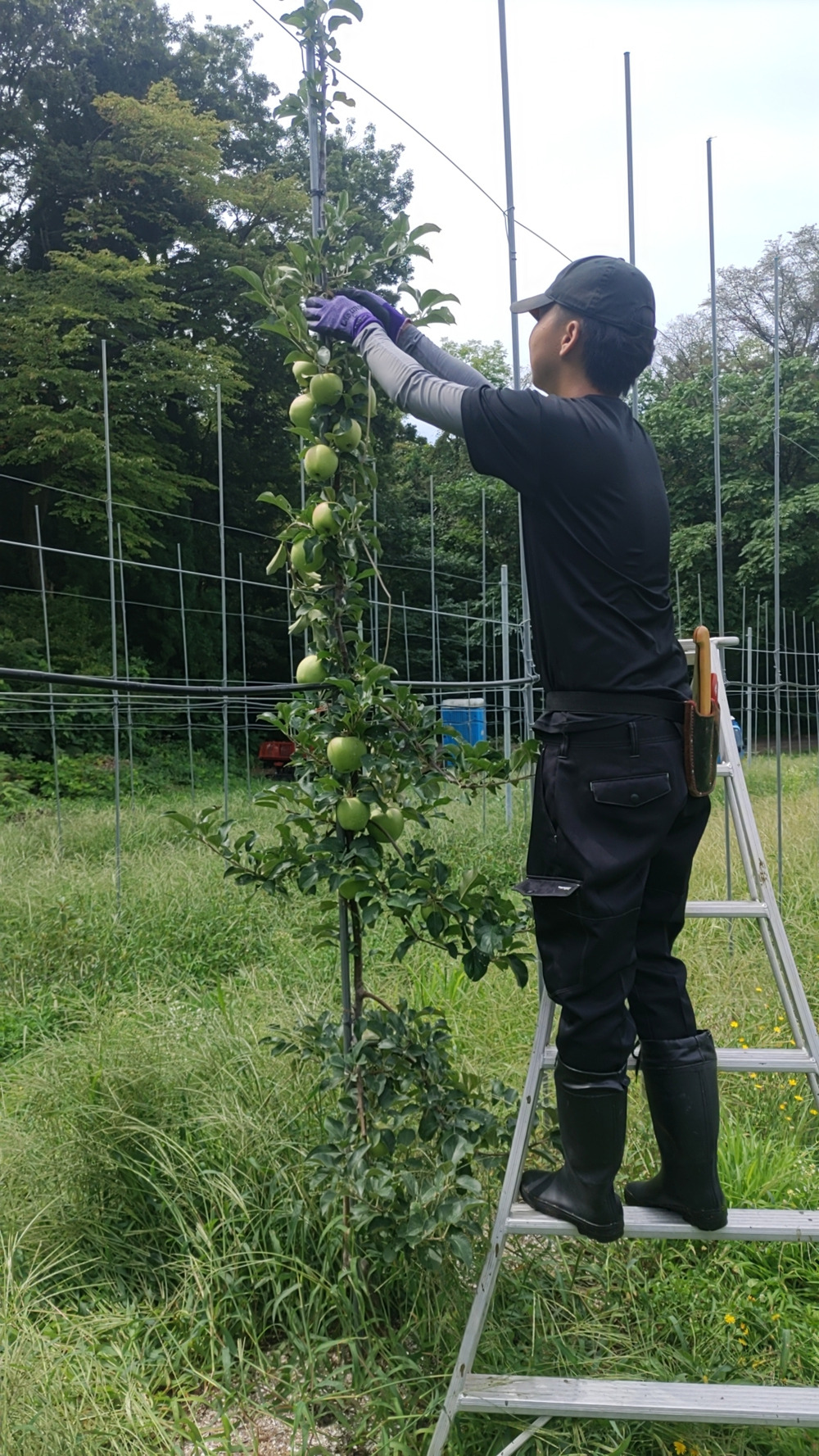 ※「下垂誘引」とは、果樹栽培、特にりんごの高密植栽培で行われる作業で、枝を下向きに固定することで、日当たりを良くし、花芽をつけやすくする技術です。この作業は、雪による枝折れを防ぎ、下枝を増やして作業効率を向上させる効果もあります。