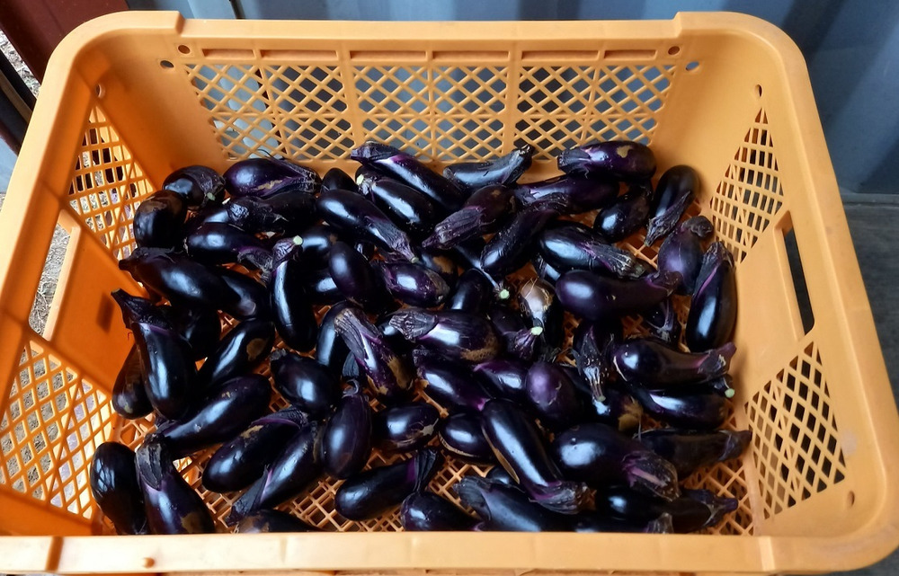 朝、雨がそんなに、大雨でもなかったので、雨が、ひどくなる前に、なすを収穫しました。