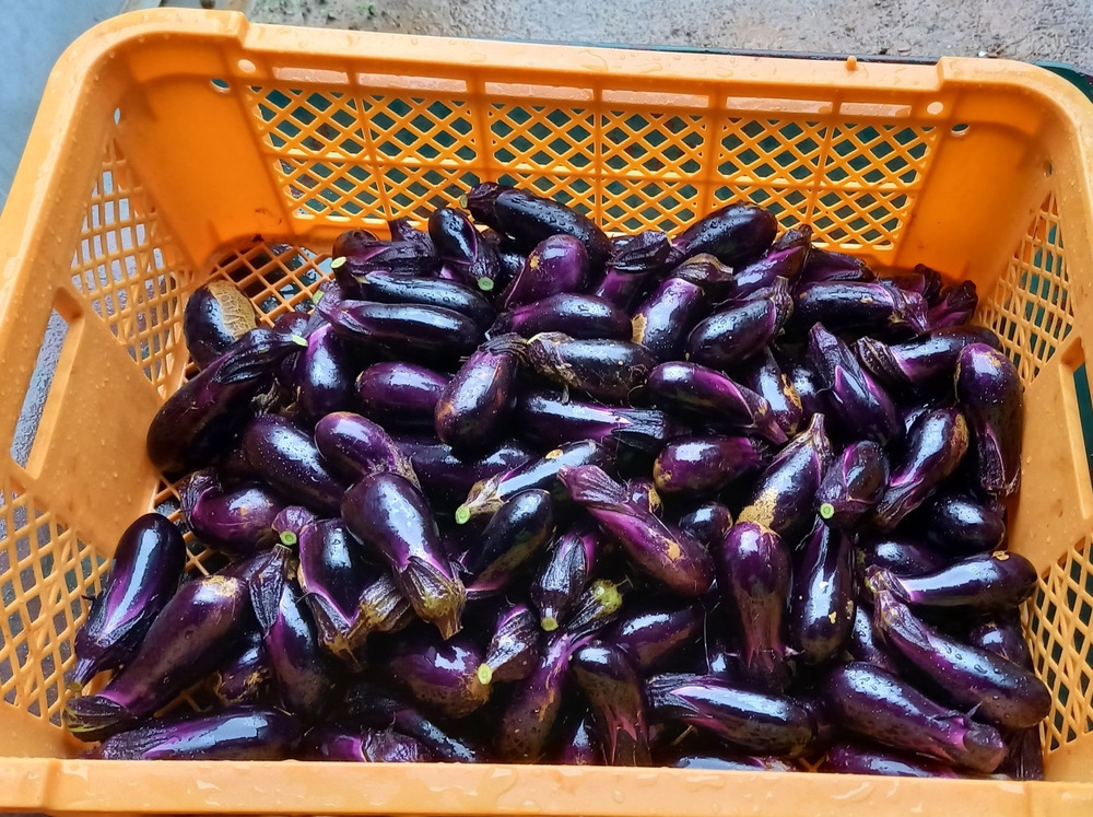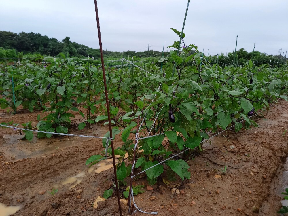 なすを、雨の中、収穫しました。ここ数日の雨で、収穫量が減っています。