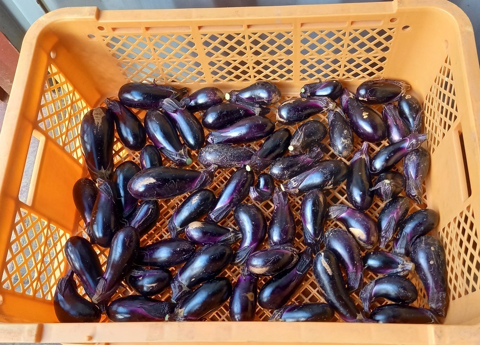 今朝は、約1週間ぶりに、晴れていました。晴れているうちに、なすを急いで収穫しました。昨日の大雨の影響でしょうか。なすに、跳ね返りの土が、かなり、ついいました。