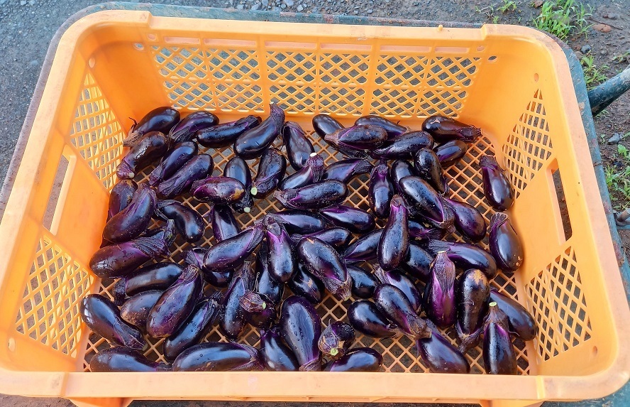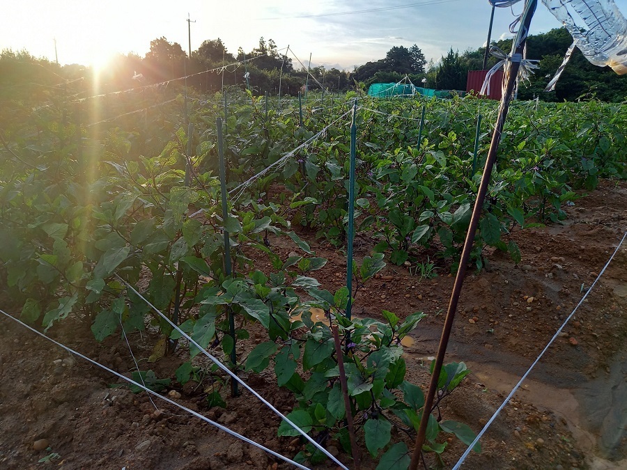 今朝は、昨夜まで降っていた雨が止んでいて、日が射していました。雨に濡れることなく、なすを収穫することができました。また、にんじん・大根等予定地の土が側溝に流出していなくてホッと人安心でした。