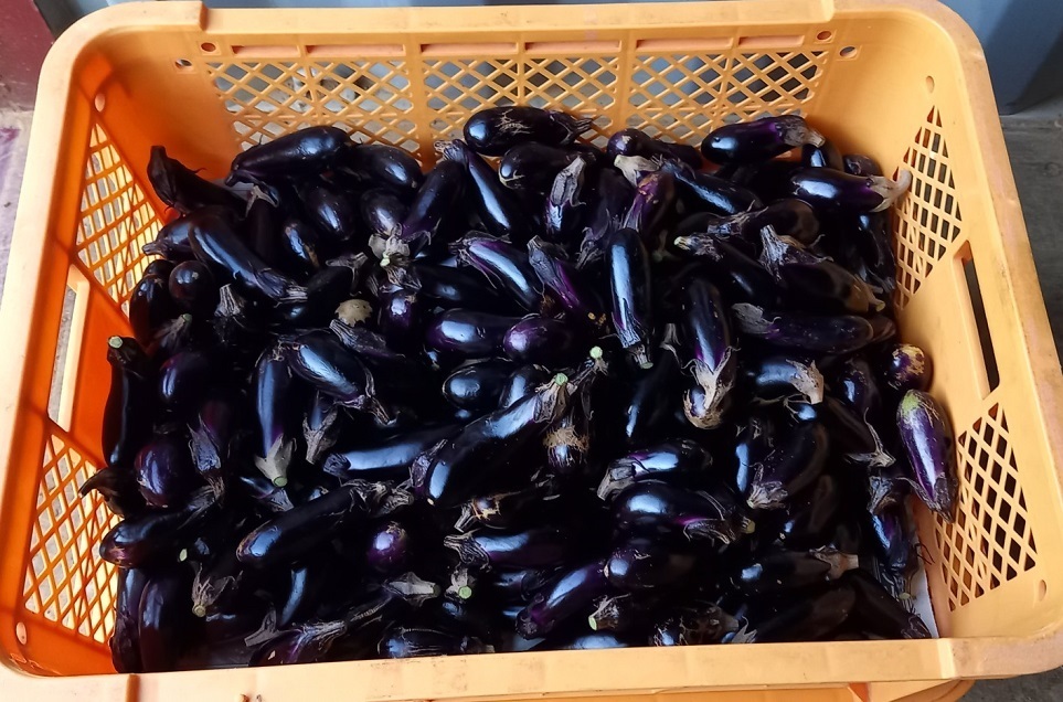 今日も、今朝、なすを収穫しました。今日は、久しぶりに食べチョク経由でお客様の注文もあったので、その分を含めて収穫をしました。