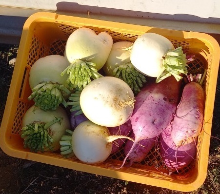 今日も、寒い中、春菊と、聖護院大根・赤大根(もみじ)を収穫しました。