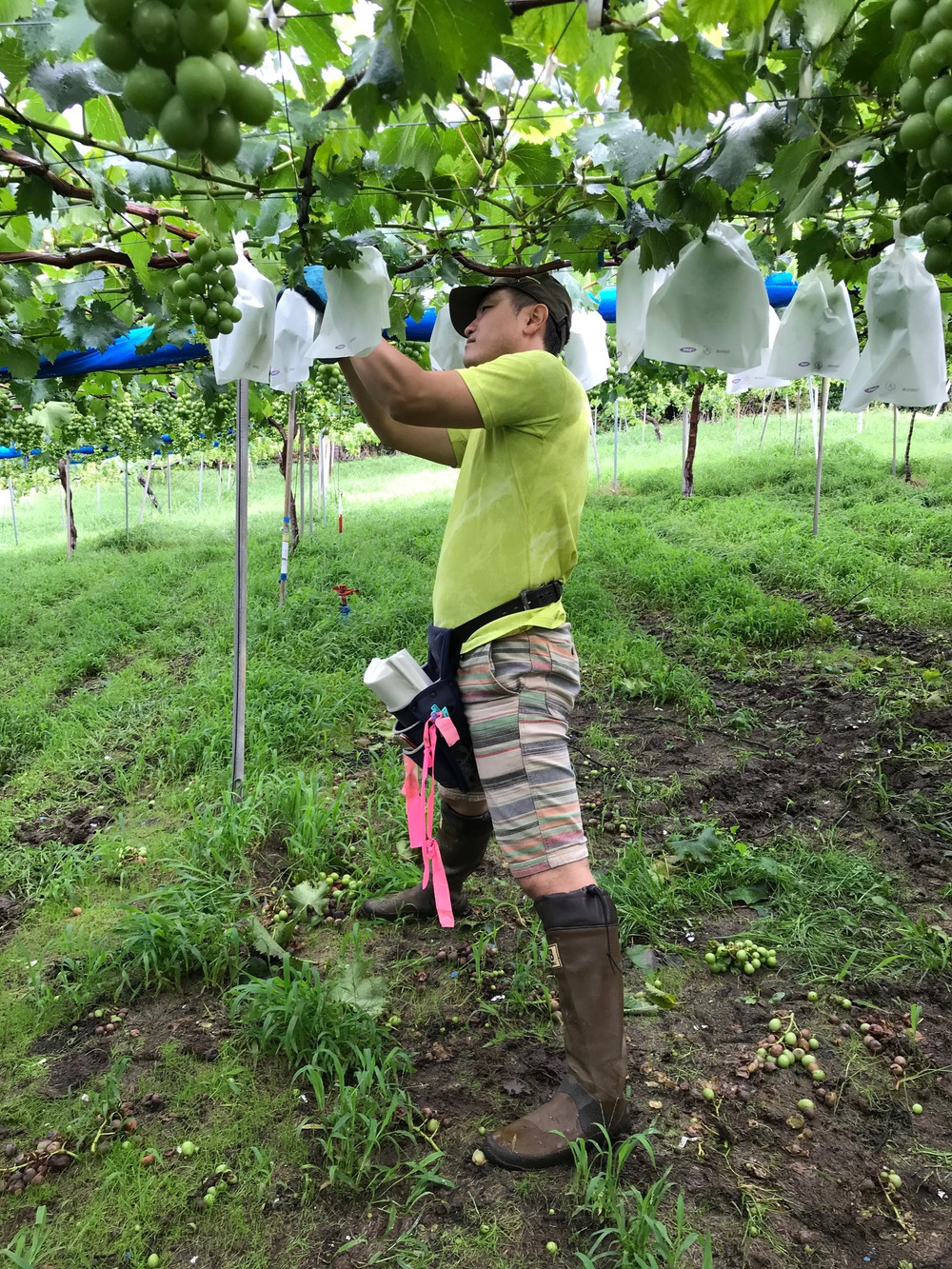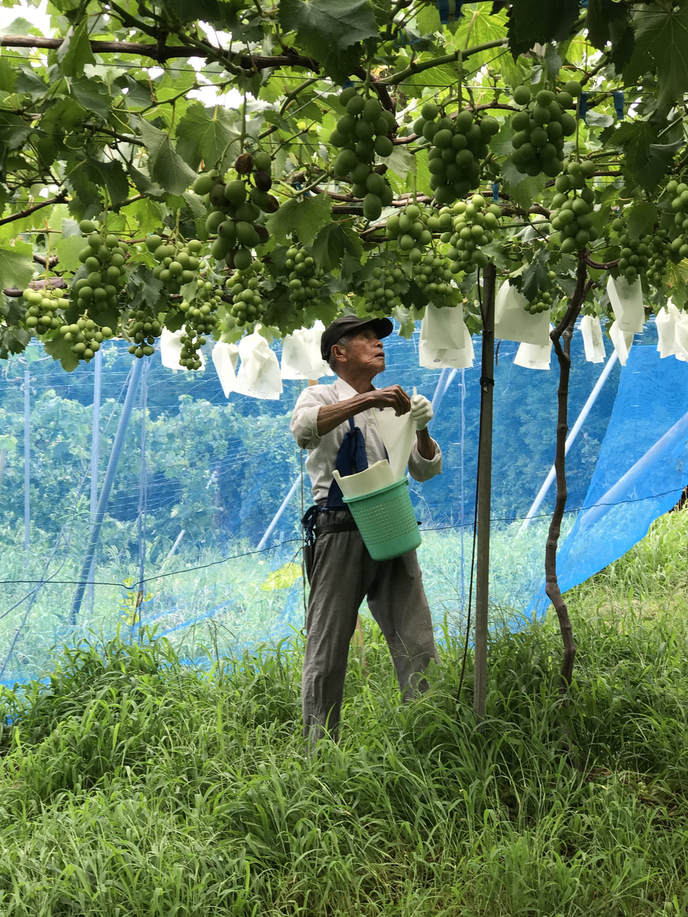 さて、袋掛け作業は梅雨空の合間を縫って一気に仕上げました。袋掛け作業には防虫、防菌、獣害対策として行います。一房一房5人がかりで袋でぶどうを包んでいきます。