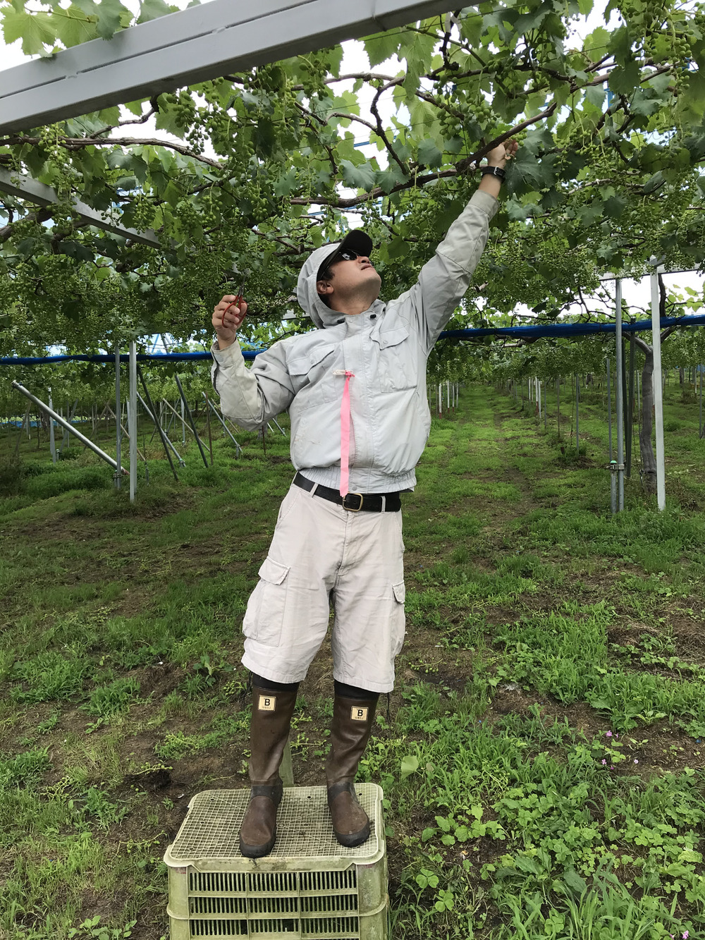 房落としが終わったら、小さい実や割れた実を取り除く摘粒作業をします。実同士がつぶし合うのを防止します。病気の予防にもなります。