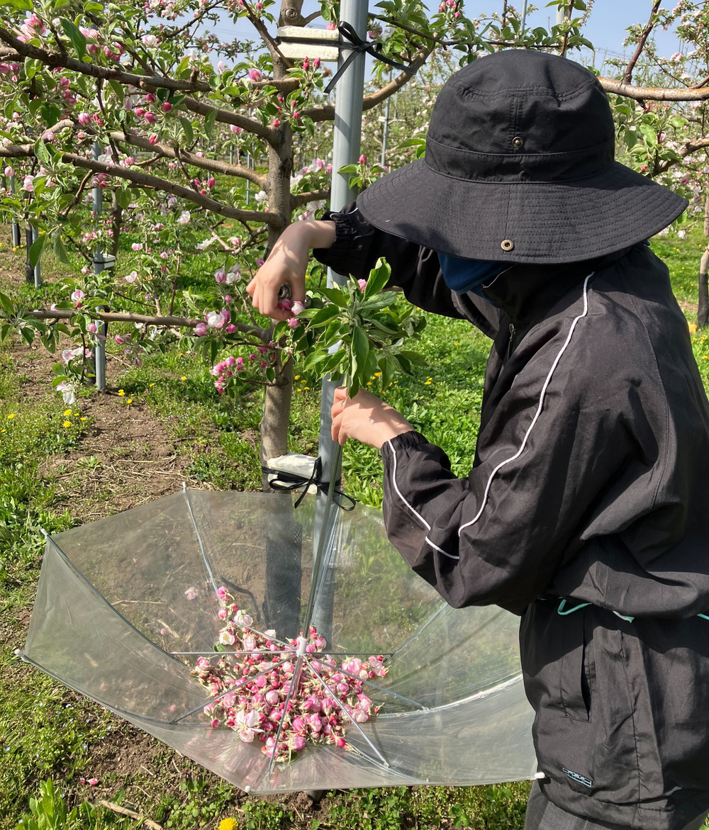 たとえば「ふじの花」に「王林の花粉」など、別の品種の花粉がつくことでりんごが実っていくんですよ。