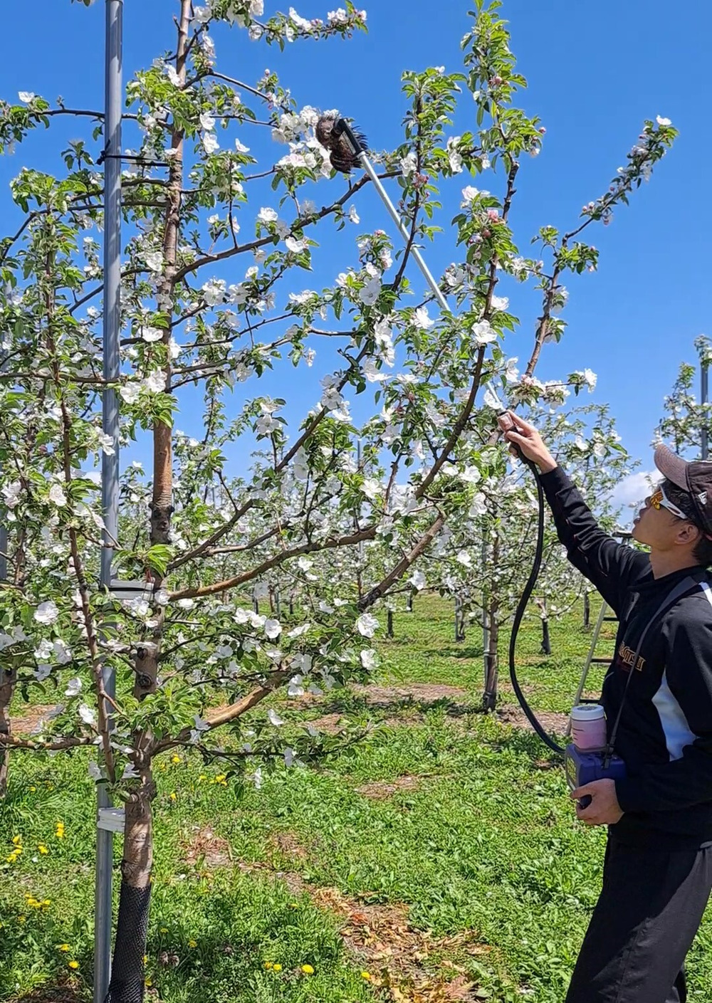 当園では薬剤散布にも使うスプレーヤーで花粉を散布したり、授粉機を使ったりしています。