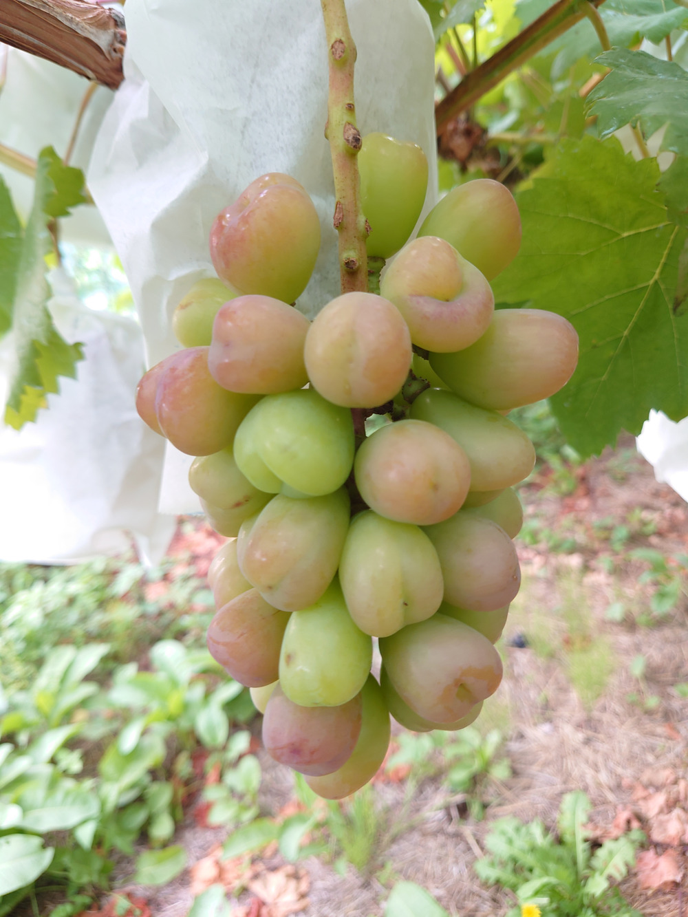 今年は一本だけナガノパープルの摘粒をめちゃくちゃ早くやって温度かけてどれだけ大きな粒になるかやった木があったのだけれど、1粒約25gくらいで1房700gくらいの巨大な房になってしまった。房を覆っている袋も大きいの使っているのにぱんぱんにはちきれそうになっている。