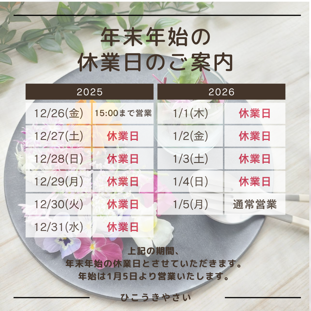 2025/12/27(土)~ 2026/1/4(日)まで冬季休暇をいただきます。
