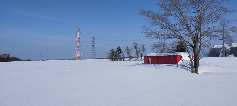 今日はとても良い天気で予報では7℃まで気温が上がるそうなので、朝から頑張って融雪用アッシュをハウス支柱周辺に散布しました。