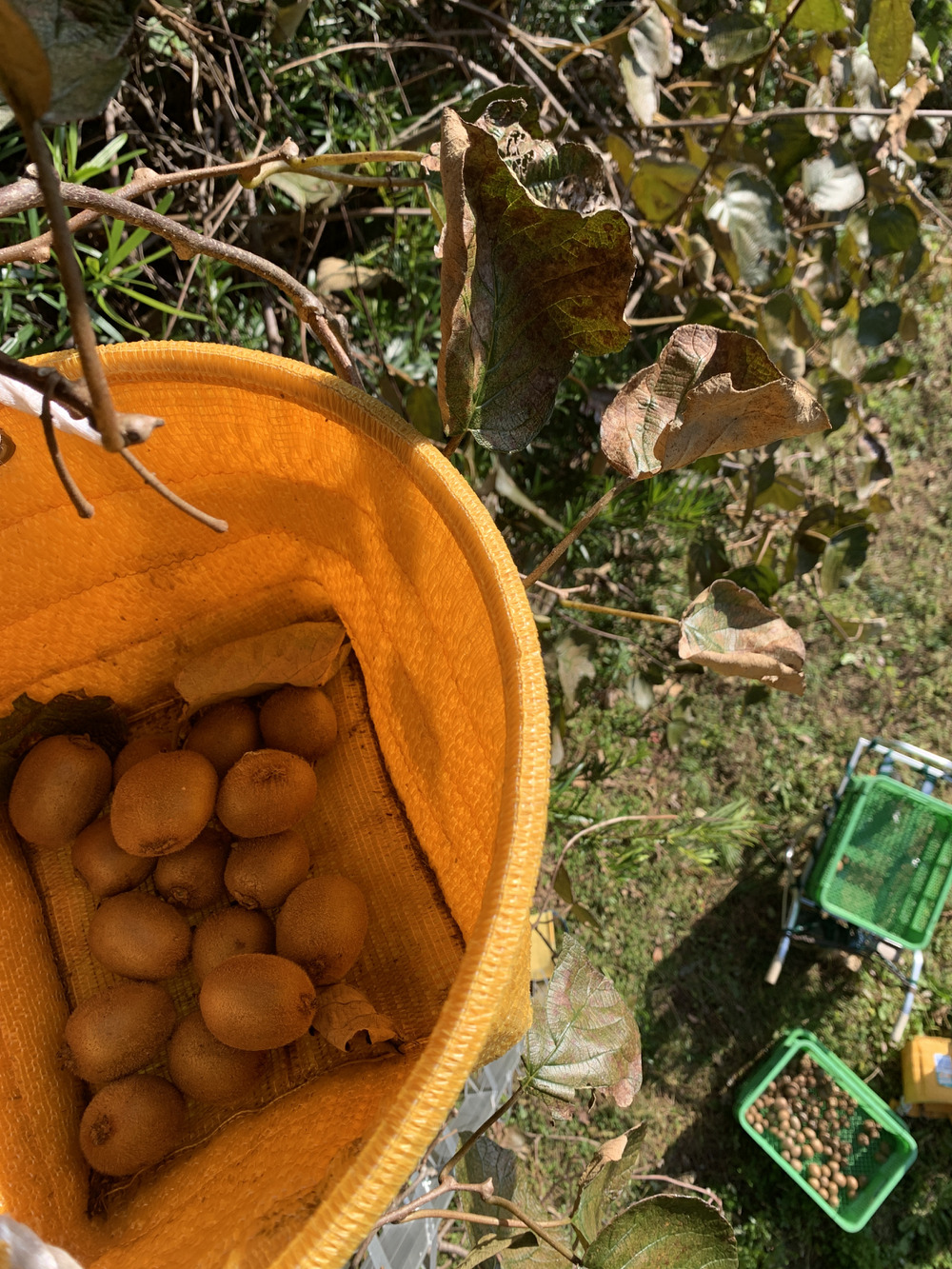 キウイ棚の下で実った姫なり、ほうろくの収穫を終えて、先週からワイルドの収穫に入っております。ワイルドは、キウイ畑を囲む背の高い防風林に巻き付いて実るので、収穫は命懸け。命綱を付け、ヘルメットを被り、林業用の梯子を使って収穫します。そうまでして取るのは、美味しいから。姫なり、ほうろくには無い、パンチの効いた濃厚な味わいを、お試しいただけたら嬉しいです。