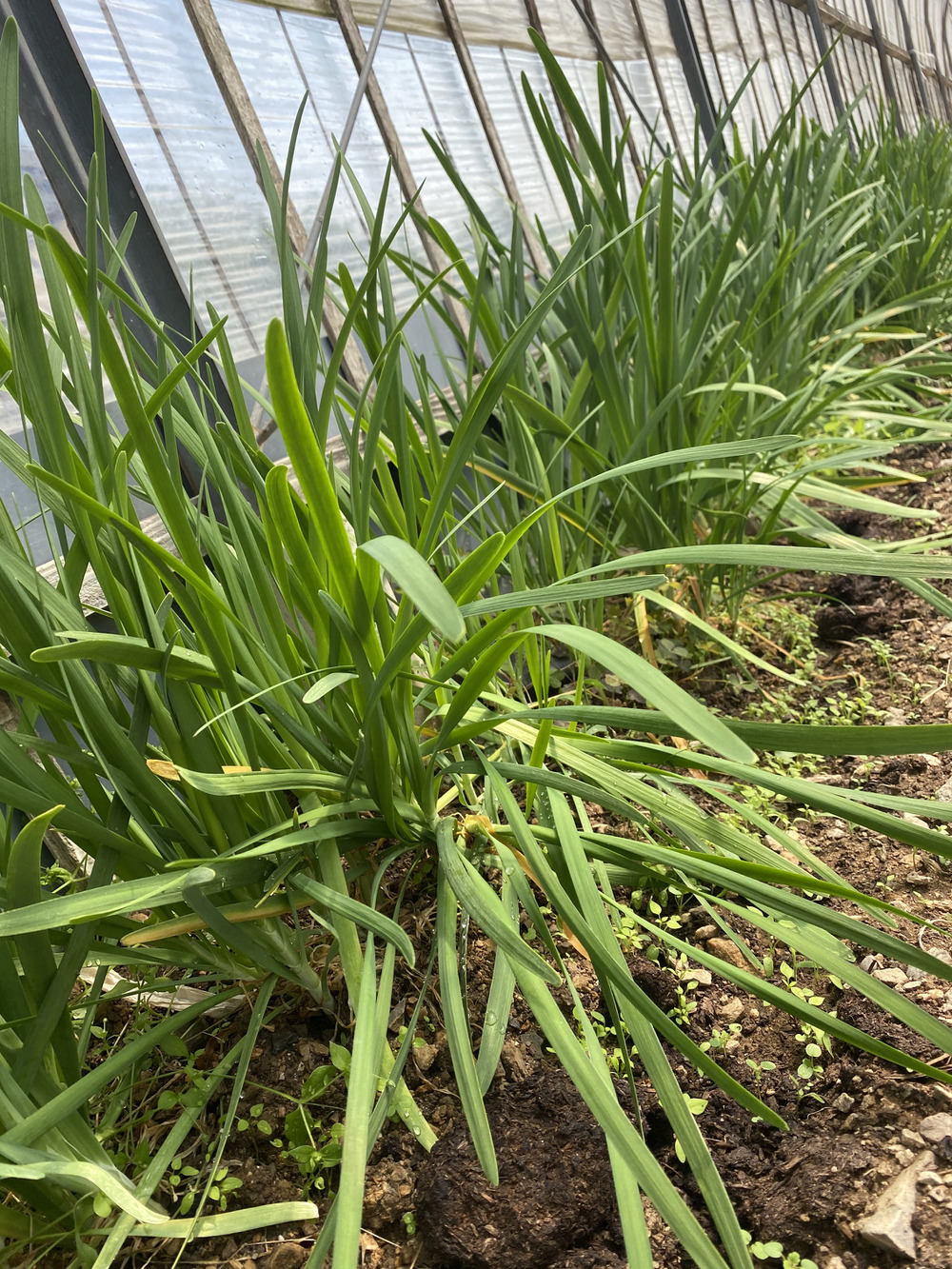 ハウス栽培のニラが元氣いっぱいに育ています。