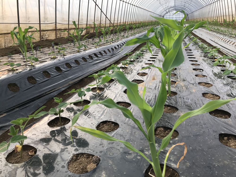写真はとうもろこしと枝豆、このところググッと大きくなってきています。