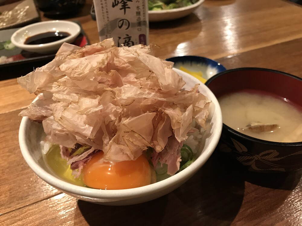 荒く削ったたっぷりのおかかと長ネギの下に、卵が隠れていました。