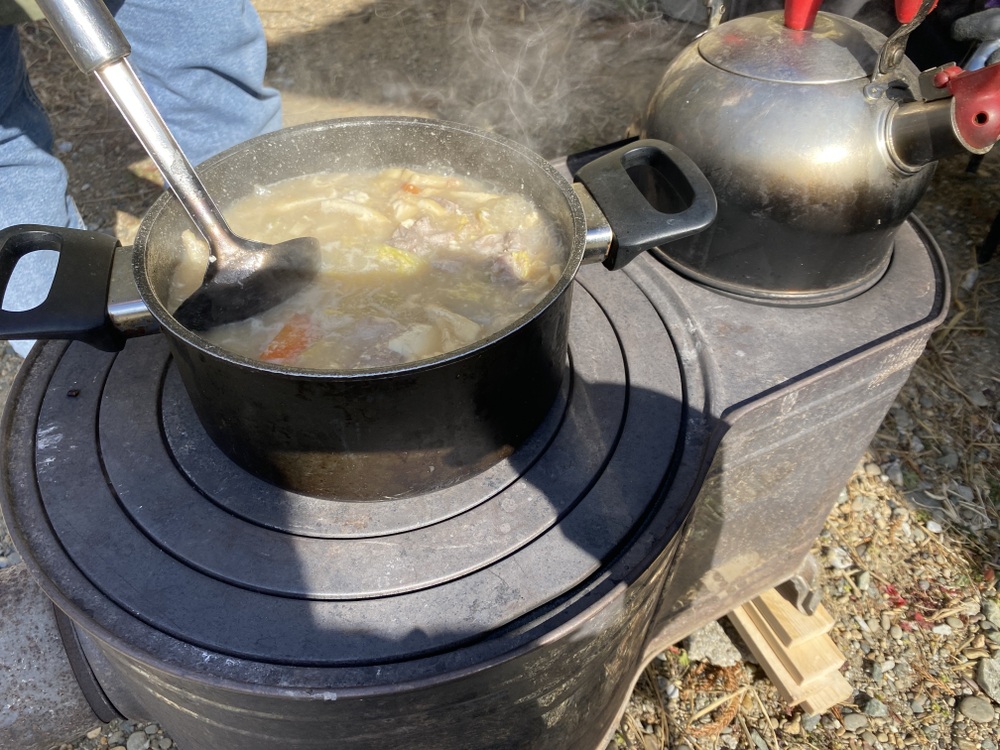 冷えた体に、ストーブの火と温かい豚汁がしみる。
