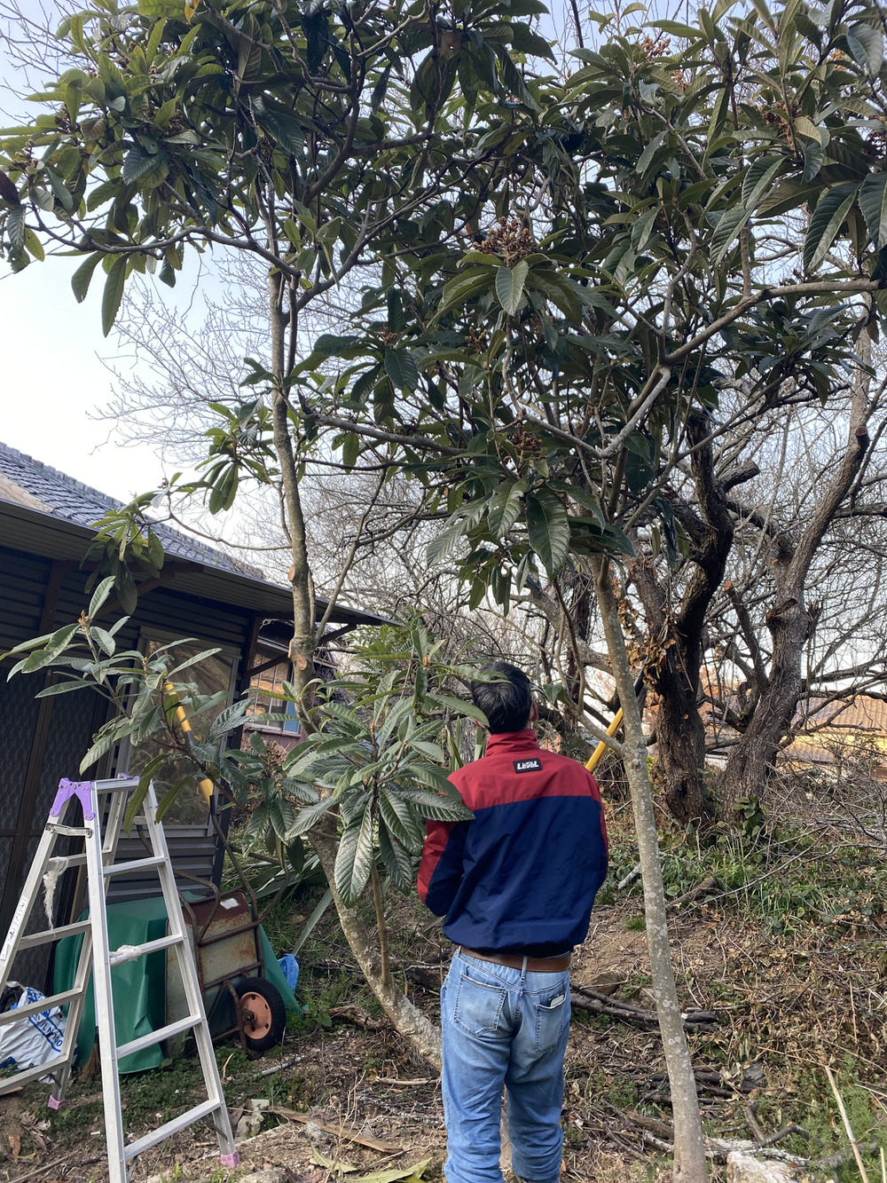今回夏場は日陰になってよかったびわの木だけど、屋根まで伸びて葉っぱや実が樋に溜ままちゃうのでバッサリ✂️剪定