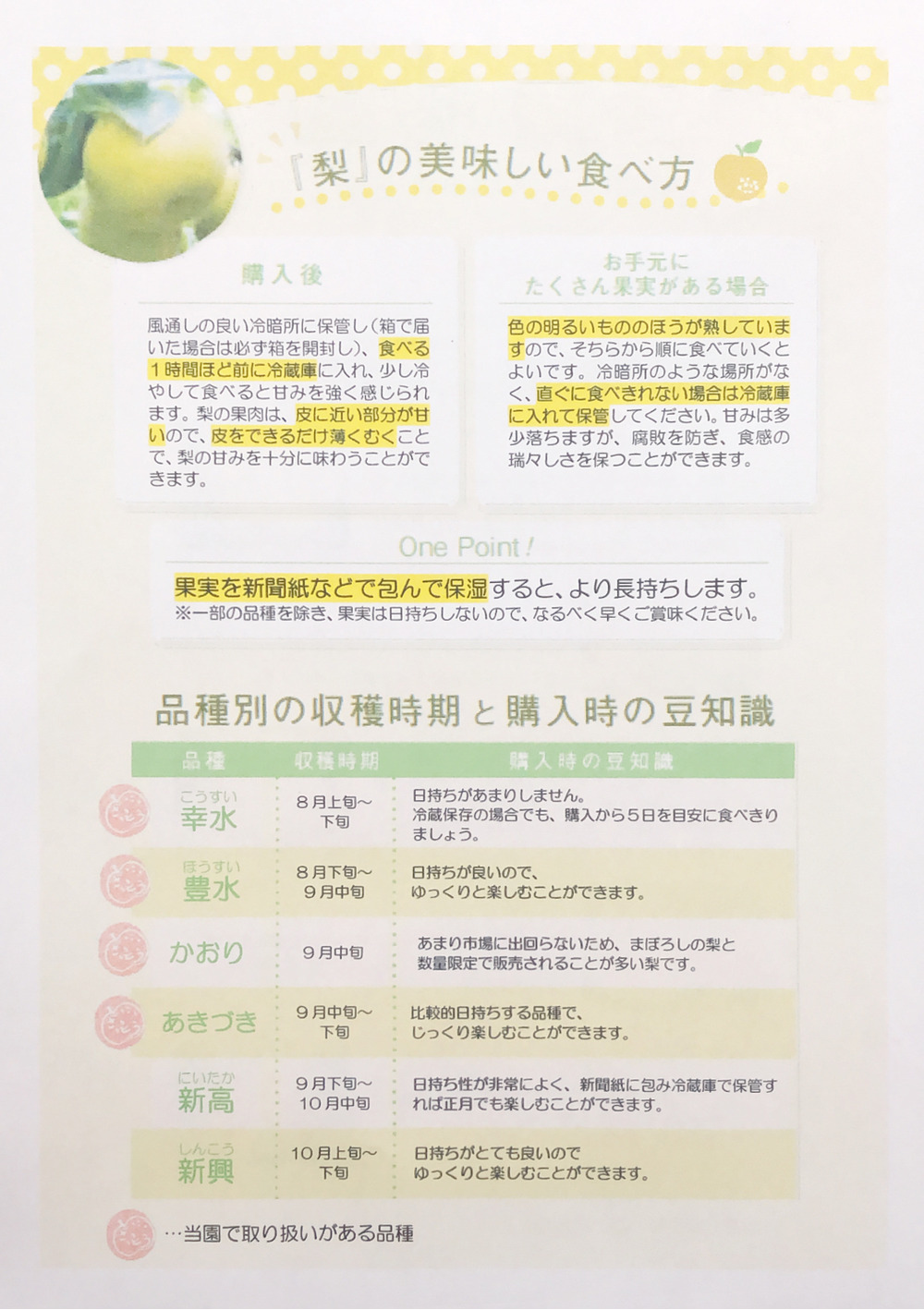 今年、購入してくださった方に梨の保存方法や種類等が書かれたものを同封しておりましたが、印刷機の不調により本日発送の商品からチラシの同封ができなくなってしまいました。ご迷惑をおかけし、申し訳ありません。