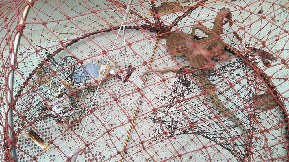 カゴをあげると見にくいかもしれませんが、最初にカゴの中にワタリガニが入りそれを狙いマダコが侵入。