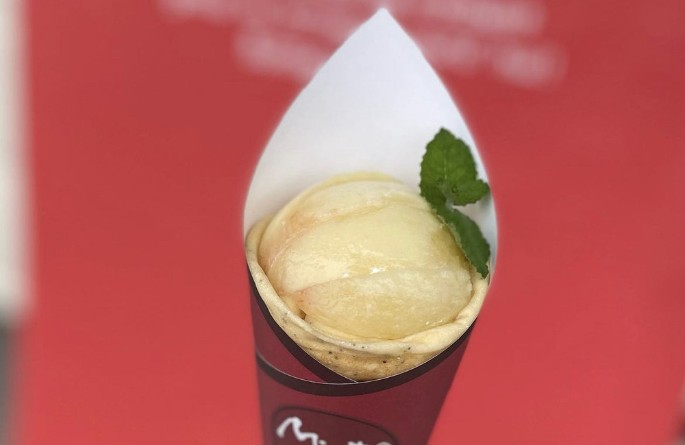 桃クレープは紅茶風味のクレープ生地に、桃1個、ホイップ、自家製カスタード、 自家製すももジャム、 サクサクのパイが入っています。