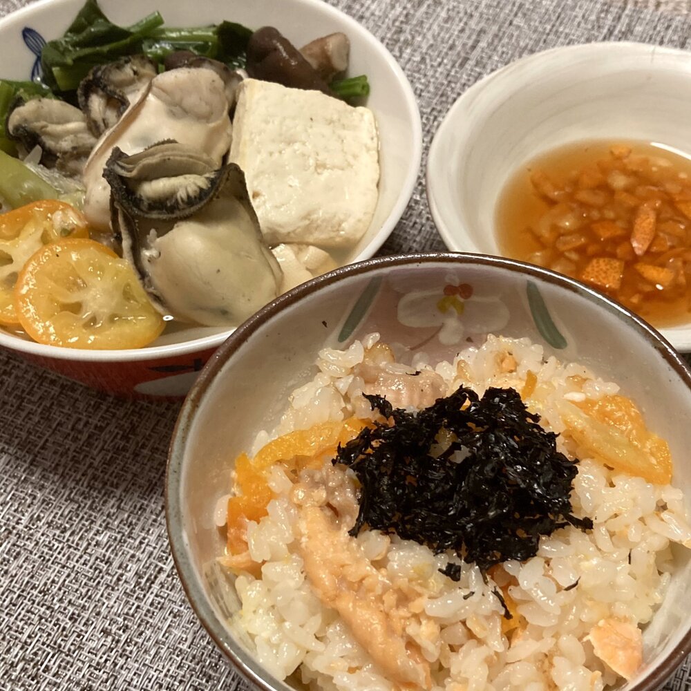 牡蠣鍋にきんかん、鍋の付けタレにきんかん、炊き込みゴハンにきんかん