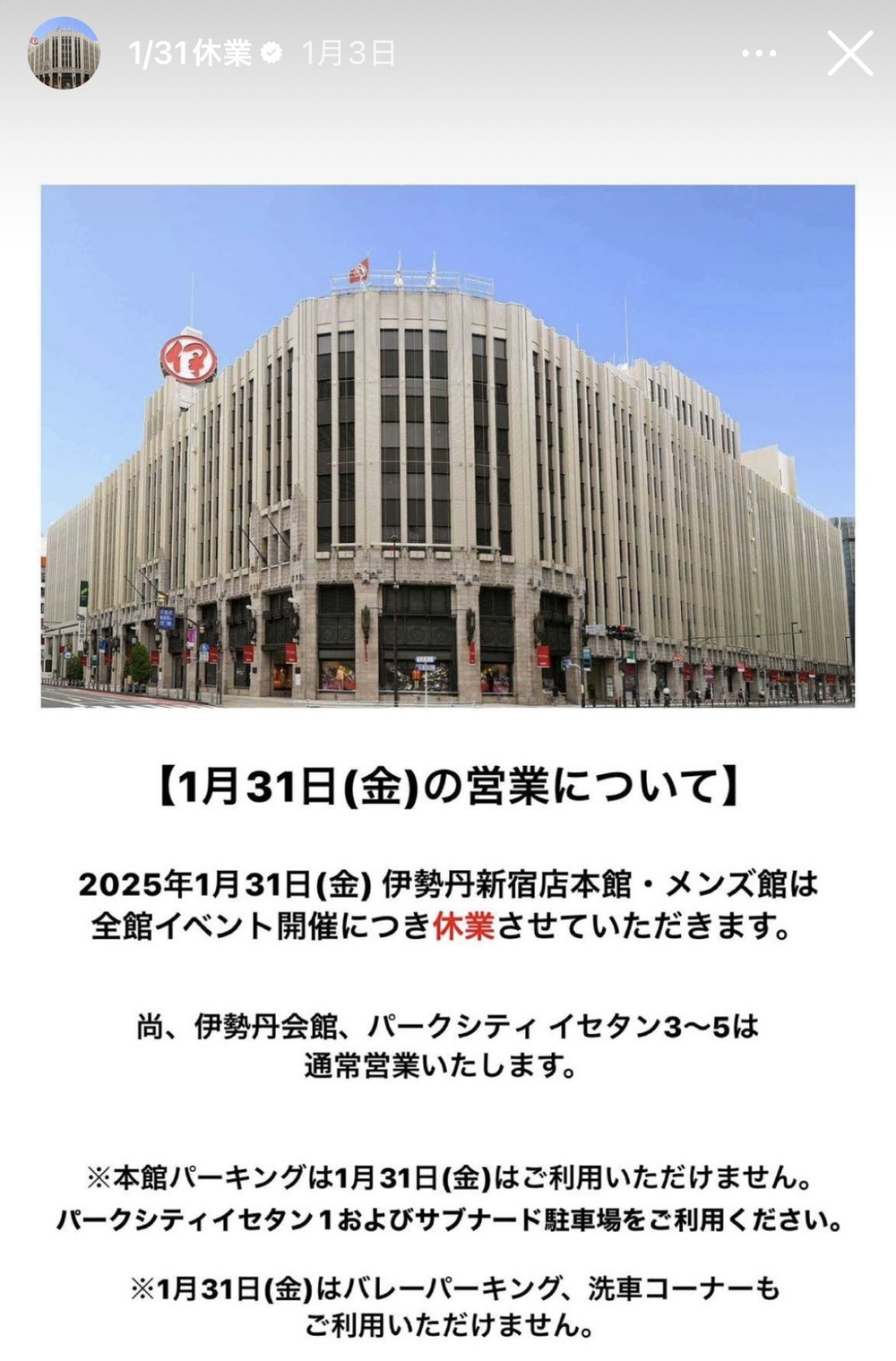 ※ 1月31日(金)はイベント開催のため「全館休業日」となり、招待状を持ったお客さまのみ来場可能となります。