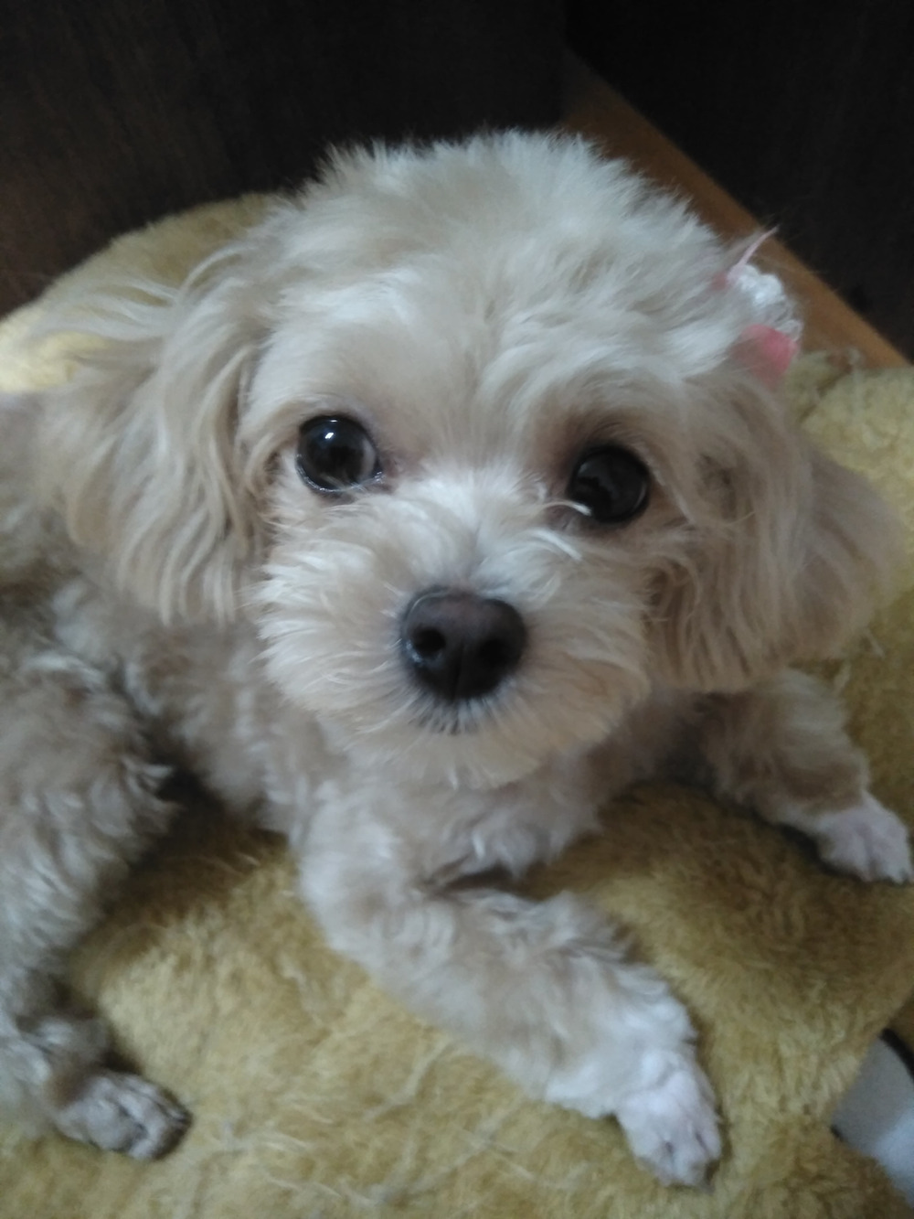 みるく⇒トイプードルとマルチーズのミックス犬、メス、2歳です。