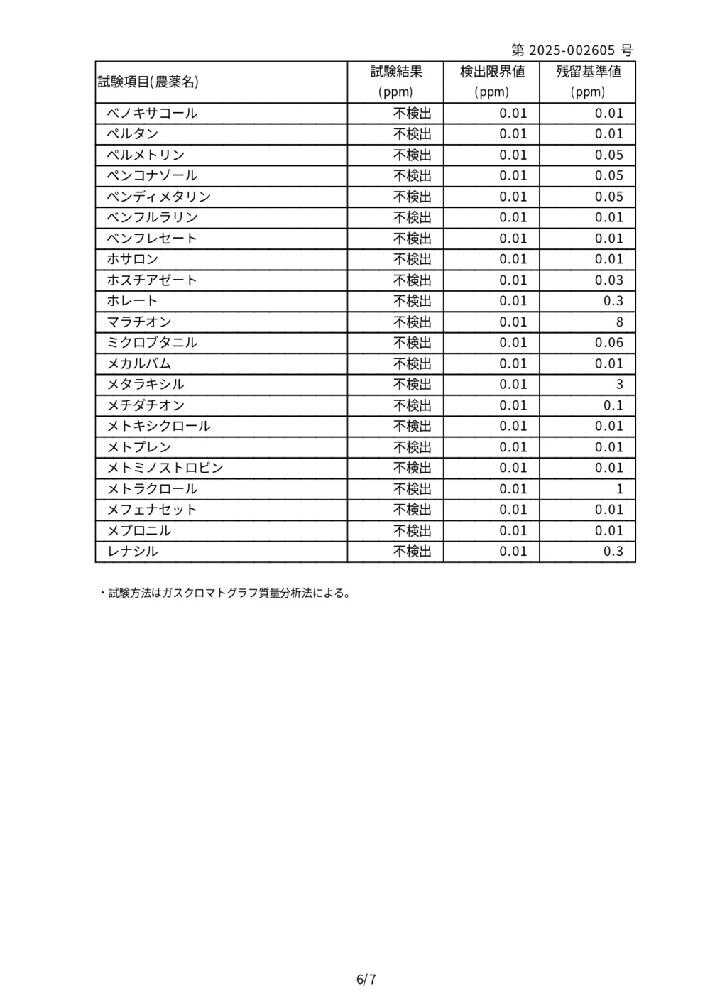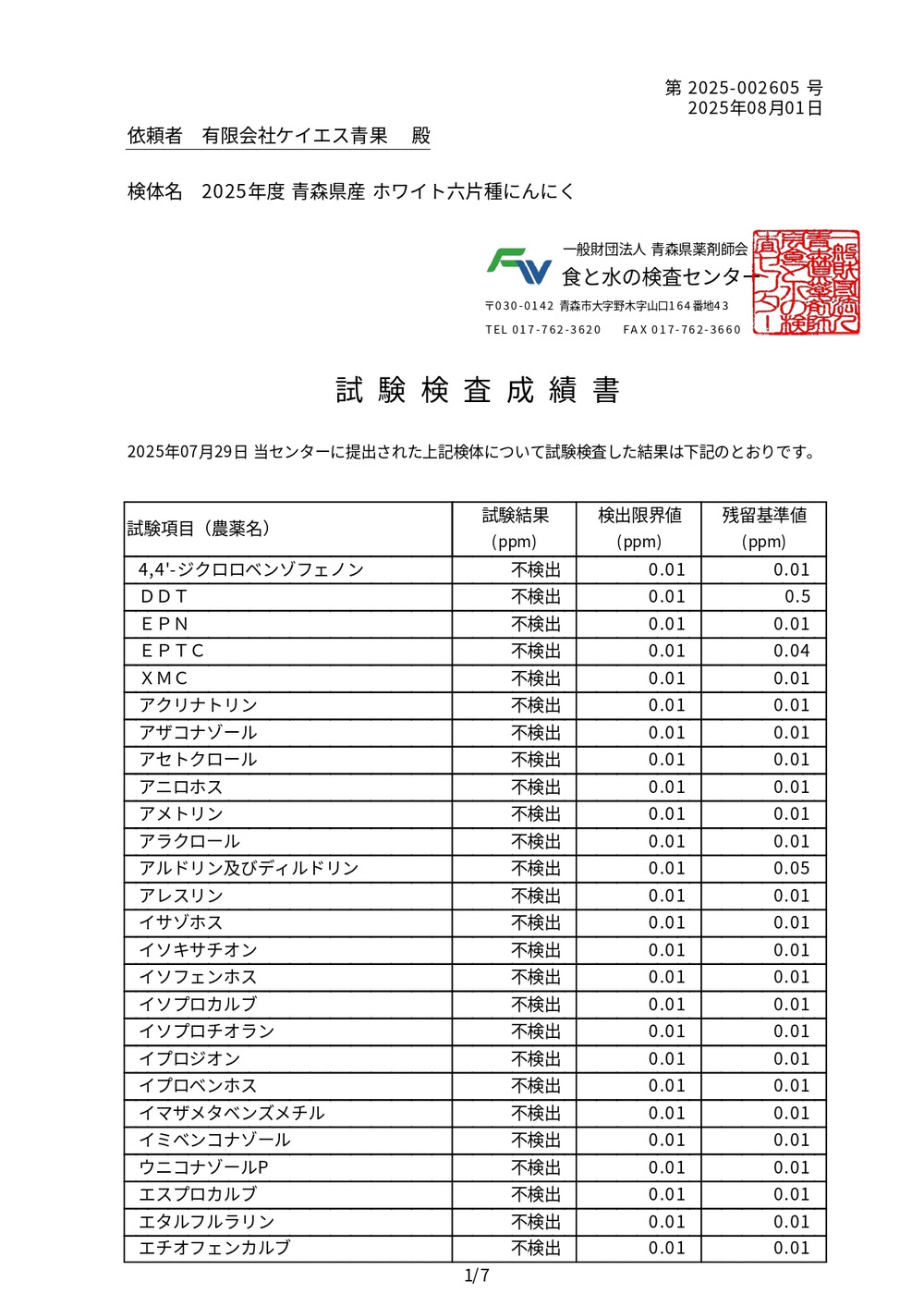 弊社の令和7年度青森県産ホワイト六片種にんにく、放射能・残留農薬検査をさせていただき、全項目不検出となりました。