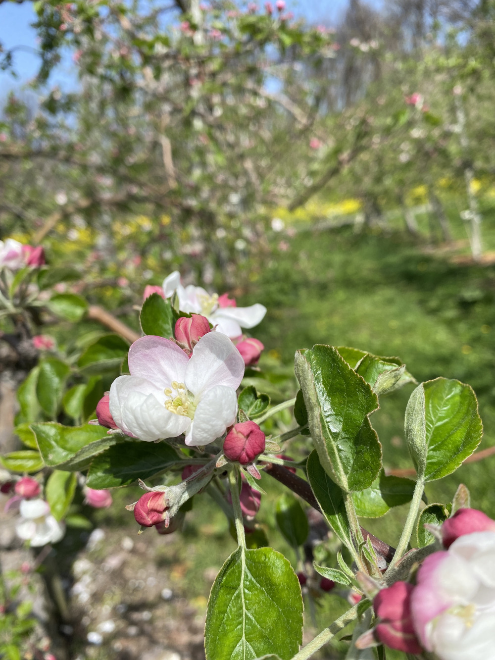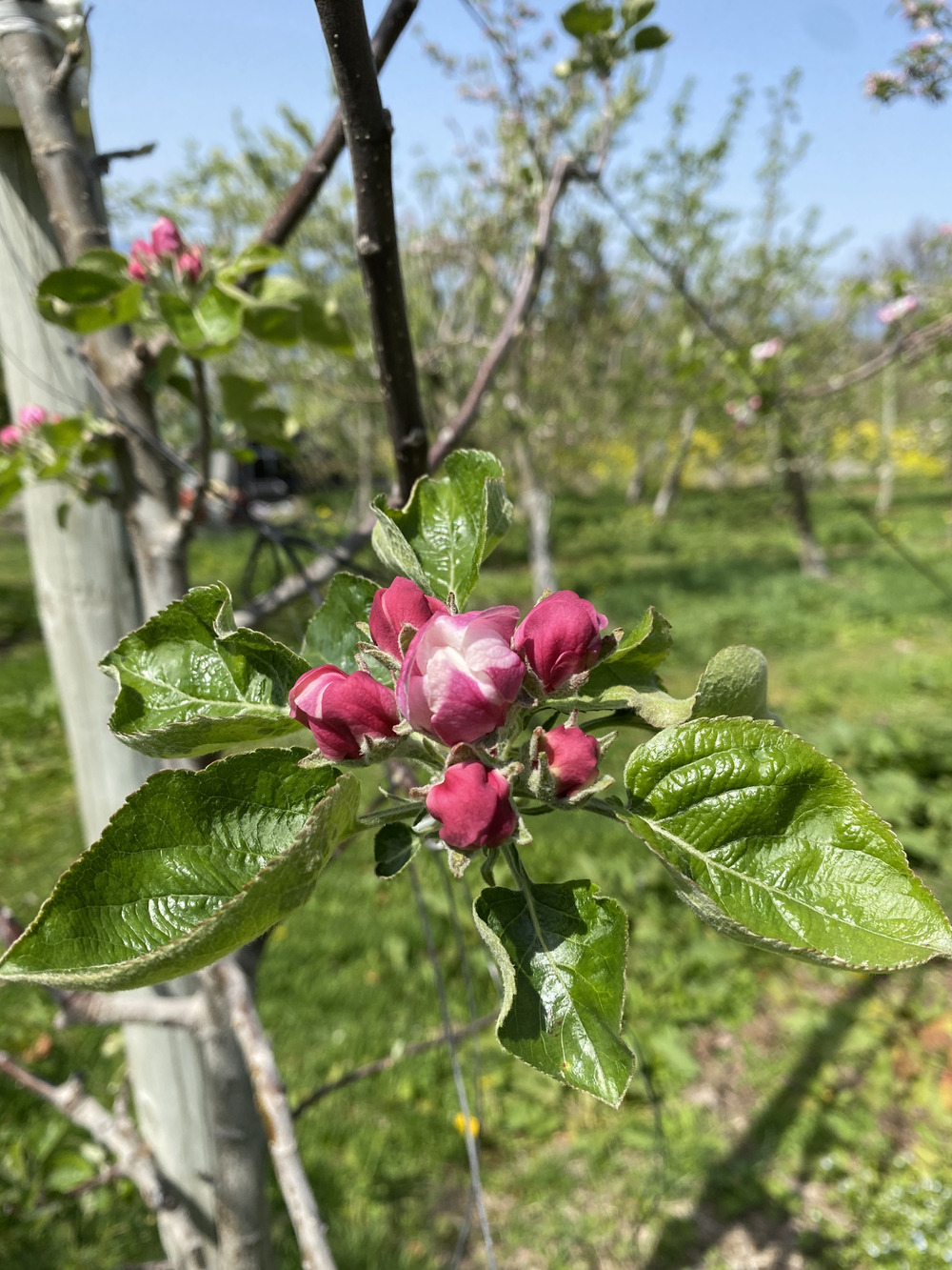 りんごの花は先に中心果が咲き、側果の蕾のピンクとのグラデーションがまた可愛らしいですよね。