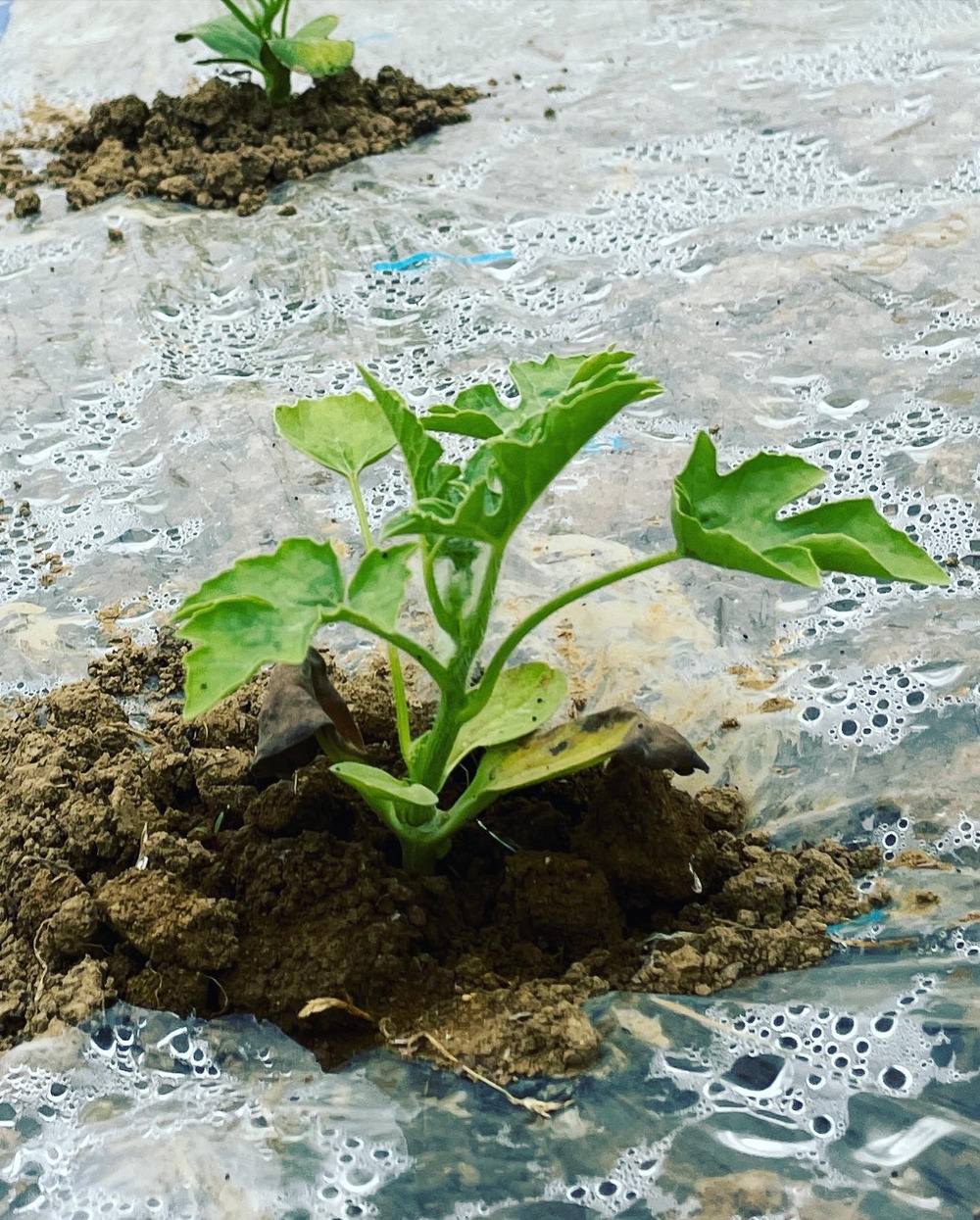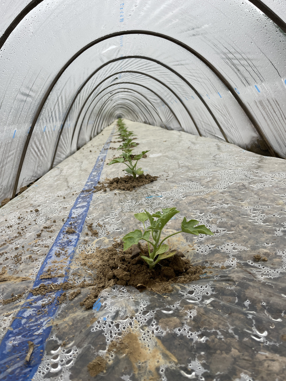 定植から約10日完全に根付きました😊1枚目が定植時、2枚目がその10日後になります❗️まだまだ小さいですが葉が5枚以上出たら今度は先端の成長点をカットして脇芽を生やしていきます🆗そして6月中旬過ぎ頃、トンネルの中がスイカの蔓でいっぱいになったらいよいよトンネル剥がしてスイカ🍉を成らせていきますよ⤴️⤴️
