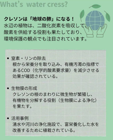 クレソンは、食べて体に良いだけでなく、そこに生えているだけで水を守り、空気を守ってくれる素晴らしい植物です。