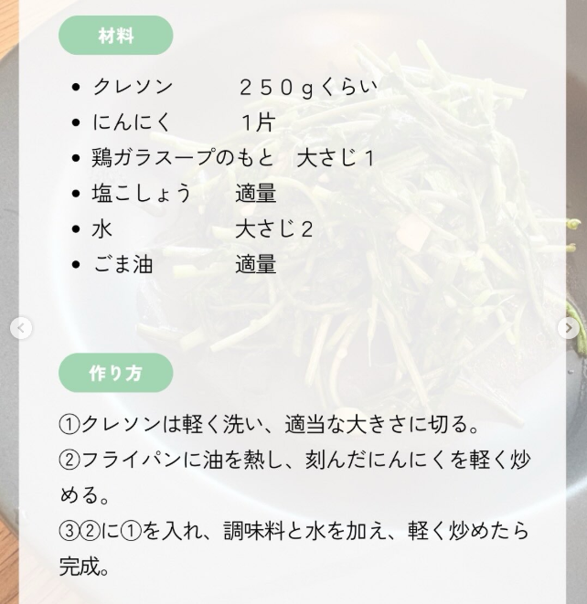 中華の青菜炒めをクレソンでアレンジ!さっと炒めるだけで完成する超簡単レシピです✨