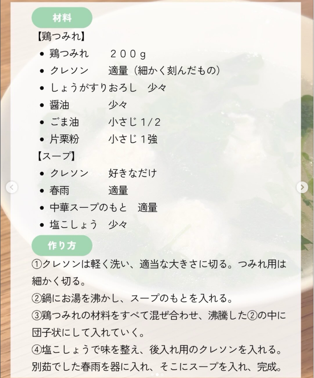 【レシピ】クレソンづくし!『クレソンと鶏つみれの春雨スープ』